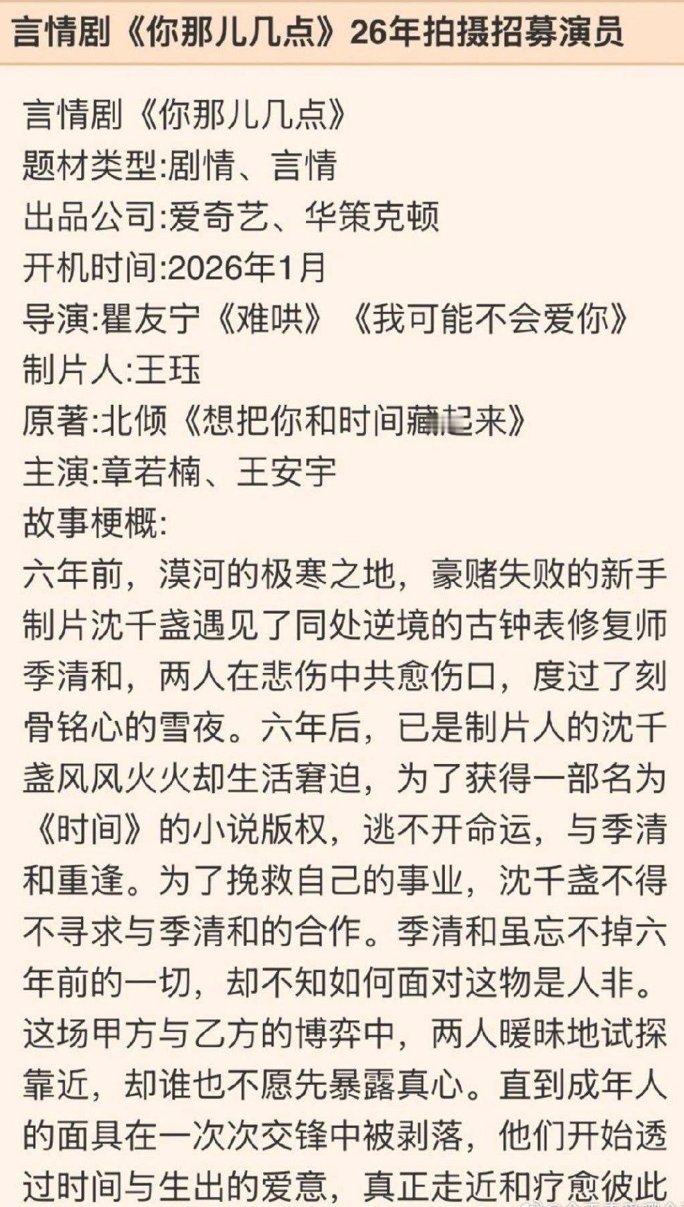章若楠、王安宇《你那儿几点》剧组招募演员,1月开机