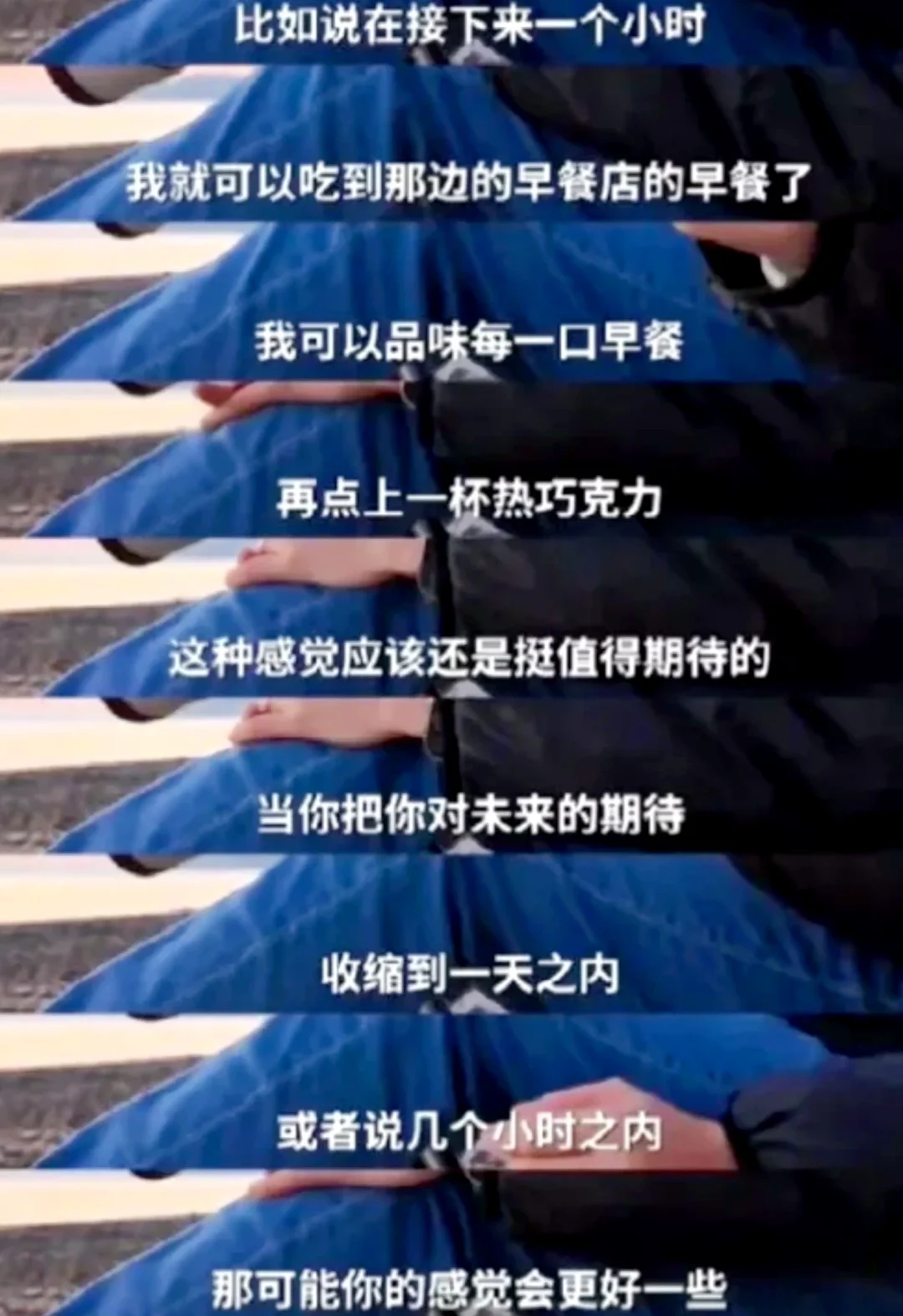 🙃但是如果说你把你的视野,不往长了看,你往短了看,要短到一个极限的感觉,比如说在接下来一个小时,我就可以吃到那边的早餐店的早餐了,我可以品味每一口早餐,再点上一杯热巧克力,这种感觉应该还是挺值得期待的。当你把你对未来的期待,收缩到一天之内,或者说几小时之内,那可能你的感觉会更好一些。