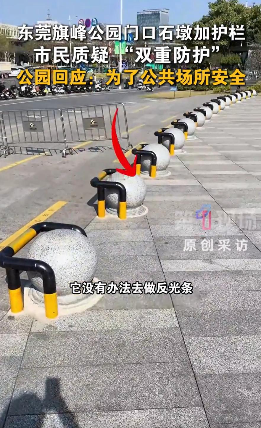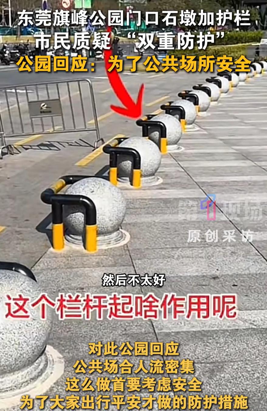 “多此一举?”广东东莞,一男子去旗峰公园遛弯,可走到大门口时,却越看越不对劲,门口不仅有石墩,石墩周围还加了一个护栏,男子一下就蒙了,不理解这样的意义何在。公园回应:是为了公共场所安全 视频中,眼前是一排常见的固定石墩,这倒没什么稀奇,可仔细一看,每个石墩周围竟然又围上了一圈金属护栏。石墩加护栏,里一层外一层,把入口守得严严实实。男子越想越纳闷:这到底是防什么呢?难道石墩自己会跑吗? 他把这一幕拍下来发到网上,果然引来不少讨论。很多人看了都笑,说这真是画蛇添足。明明石墩已经能起到阻隔作用,为什么还要多包一层护栏? 有网友开玩笑说,接下来是不是要在每个护栏旁边配个保安,防止有人撞上护栏?还有人提议,干脆在护栏后面加个靠背,走累的人还能坐下歇歇脚,也算没白费这番功夫 面对大家的疑惑,公园管理方很快给出了解释。工作人员说,最初设置石墩,是为了防止车辆随意进入,保障行人安全。但石墩是灰扑扑的水泥色,晚上灯光昏暗时不容易看清,怕有人不小心撞上去。于是他们才决定在石墩外加装护栏,并把反光条贴在护栏上,这样夜间也能明显提示路人 但许多人还是不买账。有人说,如果真怕人撞到,为什么不直接在石墩上贴反光条?既省事又省钱。也有人说,解决问题的方式有很多种,现在这个做法,看起来更像为了“解决问题”而“制造新问题”。石墩加护栏,材料、人工、维护,都是成本,效果却未必比单一措施更好 其实这也不怪大家会多想,真正成熟的公共安全设计,往往不是越多越好,而是刚刚好。能用一个反光条解决的,就不一定非要加护栏。能通过优化动线解决的,就没必要靠堆设施来兜底。安全感不只是看上去防得严,更是走起来顺、不别扭、不需要多想