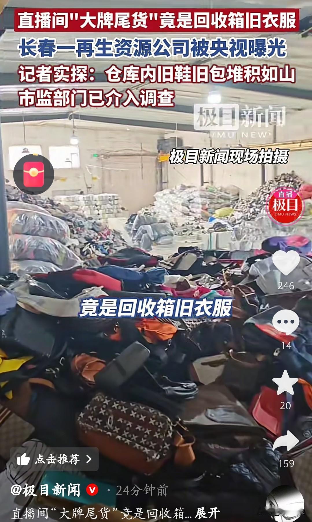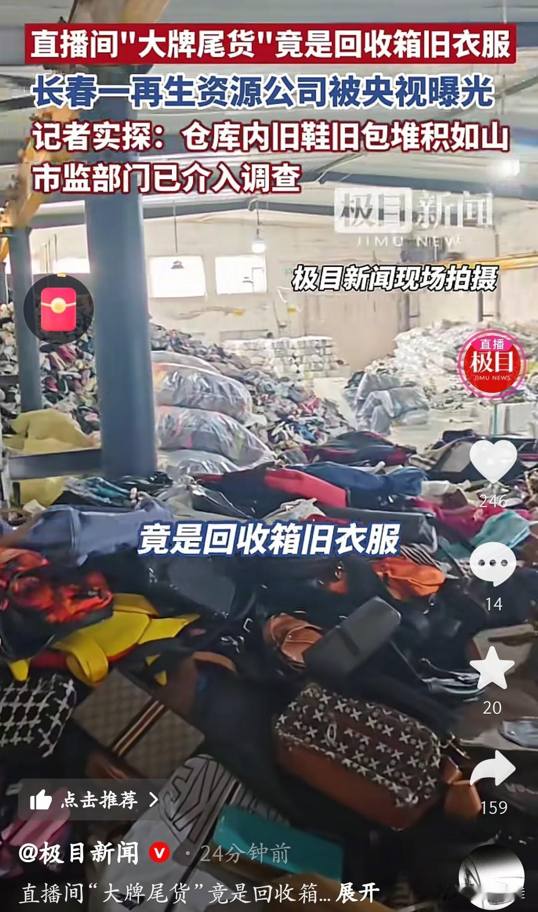 你敢信?央视都曝光了!直播间里标榜的“大牌尾货”,居然是从回收箱里捡来的旧衣服!长春一家再生资源公司被央视曝光,记者实地探访其仓库,只见旧鞋、旧包堆积如山,这些本应被公益处理或合规回收的旧衣物,竟被翻新包装成“大牌尾货”在直播间售卖。 买衣服真不如去实体店,能亲手摸面料、试版型,看得见摸得着才放心。而且逛逛街走走停停,挑挑拣拣的快乐,对着手机屏幕可体会不到!