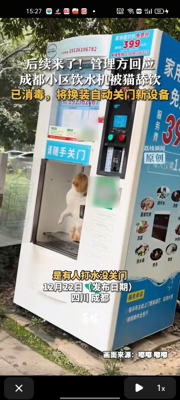 12月20日,四川成都。网友晒视频称,小区的饮水机有人打完水后没关门,小猫跑进里面舔饮,“请随手关门”这五个字被无视。饮水机管理员回应称,已对饮水机作消毒清洗,这个事不会太久了,十天半个月就换新设备了。