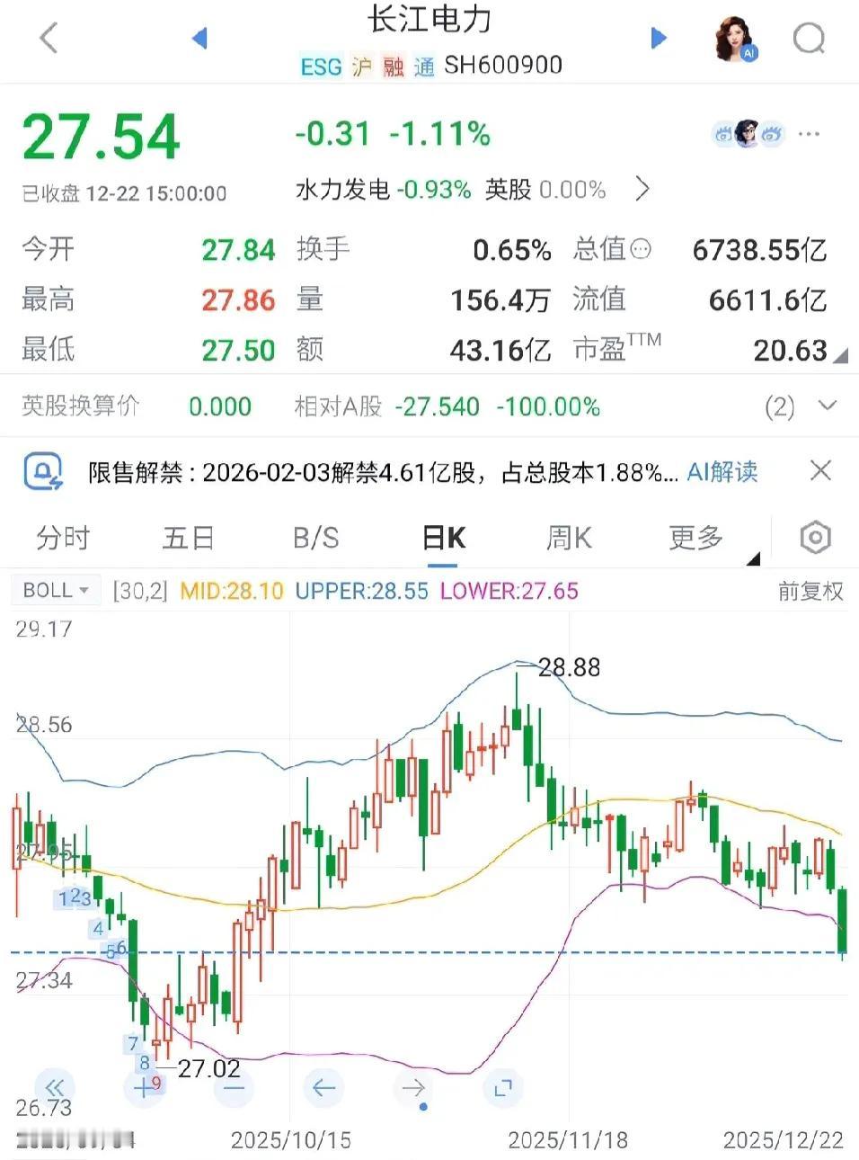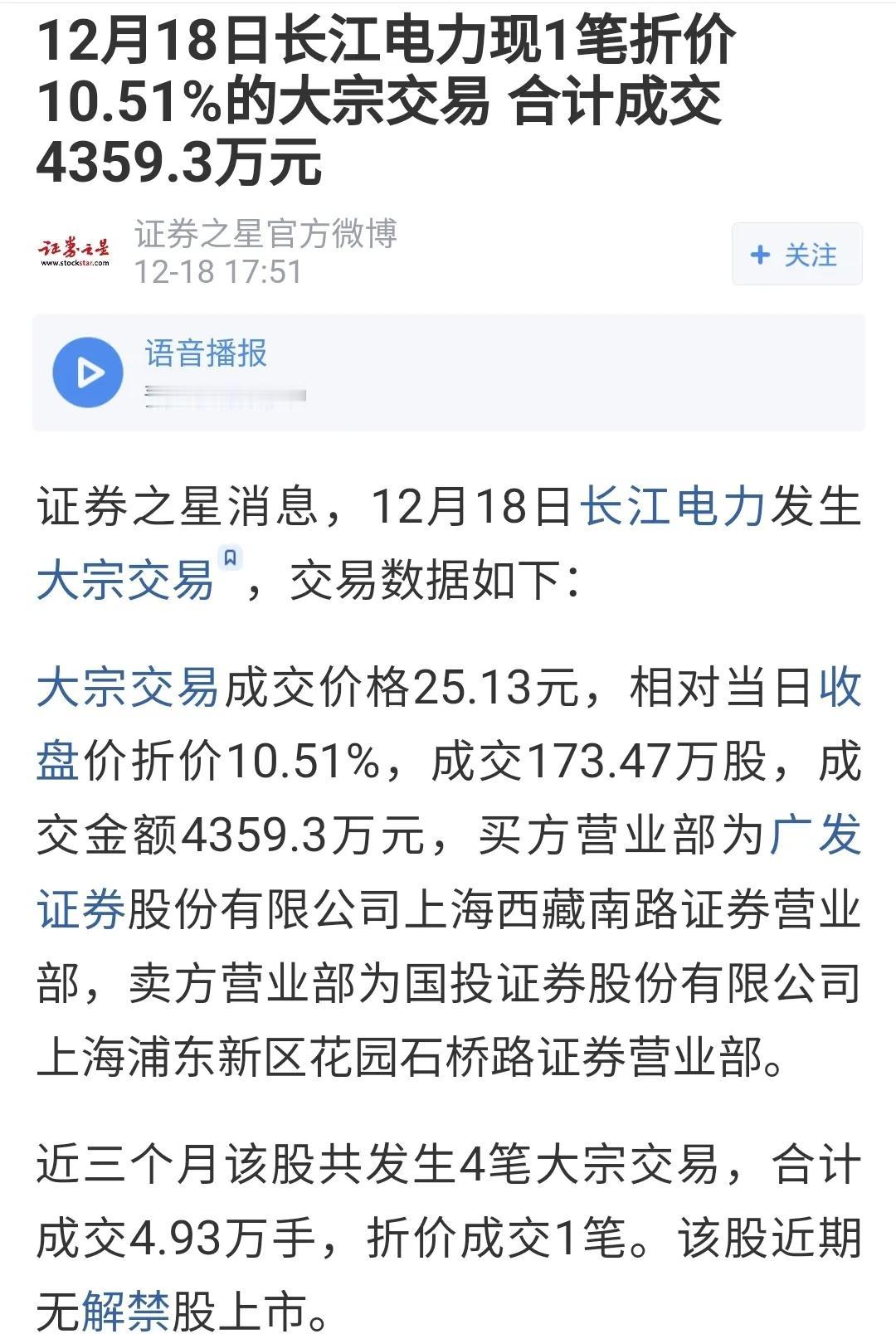 长江电力今逆市大跌,价值投资成了主力骗术?当主力还在宣扬所谓“价值投资”,把散户哄得一愣一愣时,他们自己认可目前股票的价位吗?请看长江电力实例,12月18日,“价值投资者”们常念叨的28元的长江电力,在大宗交易平台,被以10.5%的折扣价格25.13元成交。然后呢? 估计就是,买家将在普通的交易市场,慢慢地派发给散户。这不,今天长江电力,逆市下跌1.1%以上,开启真正的“价值”,25.13元,“回归”。