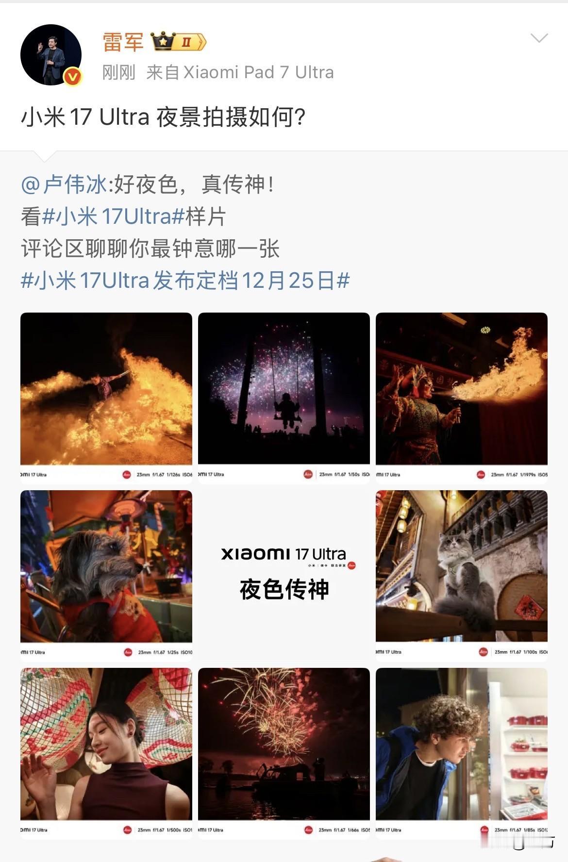 这次没小字: 雷军称小米17U 为夜色传神! 就在刚才,雷军在社交网络发了一组小米17最新拍的照片,这些照片无一例外都是在晚上拍摄的。 这一组照片的中间,他纤维小米17 UV夜色传神,这张宣传海报上面没有任何小字,唯一的小字就是这个小米17U手机是由小米和徕卡联合研发的。 与上一次他们宣传小米的某一款手机为夜色之神,这次他们宣传新手机在遣词造句上面更加的讲究,夜色传神这个就比较的严谨了。 大家可以欣赏一下这组照片当中,各种各样的场景都有,有人物的特写,也有火光的特写,还有绽放的烟花,以及人像在夜光模式下与周围环境的融合程度。