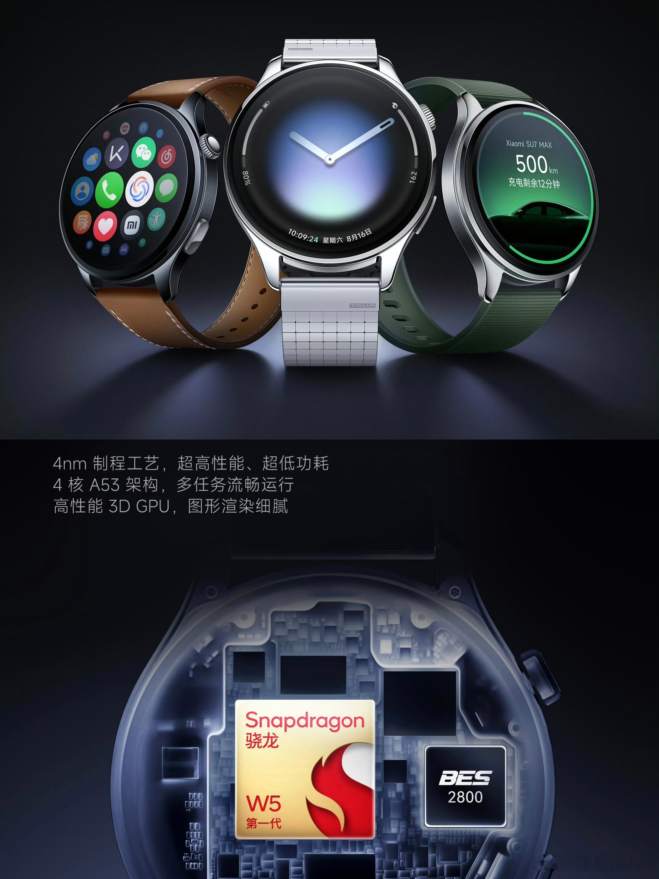 Xiaomi Watch 5是骁龙W5 Gen1+恒玄BES2800的方案。行业内安卓智能手表OPPO Watch X2也是同款方案。EMG+ECG+双面蓝宝石玻璃+不锈钢表壳。小米手表5是小米在国内市场发的第一款全智能圆表,在海外市场第一款是23年的Xiaomi Watch 2 Pro。高通虽然在8月份发布W5(+) Gen2了,但最主要的CPU和协处理器没升级,意义不大。