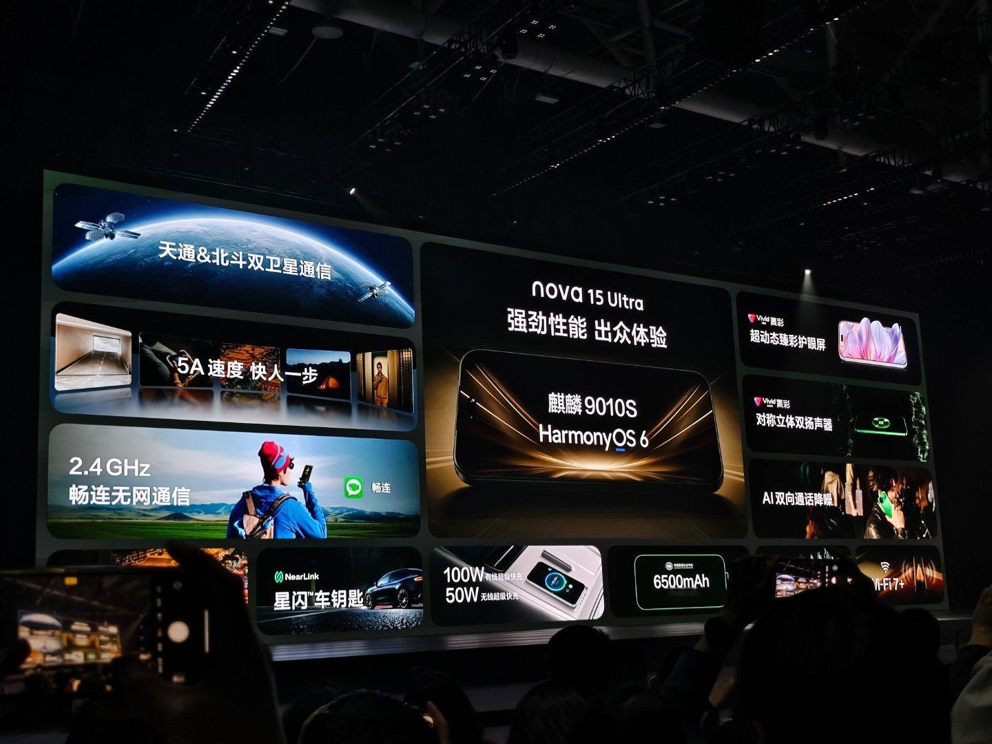 性能部分,华为nova15 UItra 搭载麒麟9010S处理器,性能提升18%,支持天网通、地网通、无网通全场景通讯。nova15 UItra 全系支持三大运营商的天通卫星通讯,nova15全系支持北斗卫星通讯。100W有线快充,50W无网闪充。华为发布会华为nova15及全场景新品发布