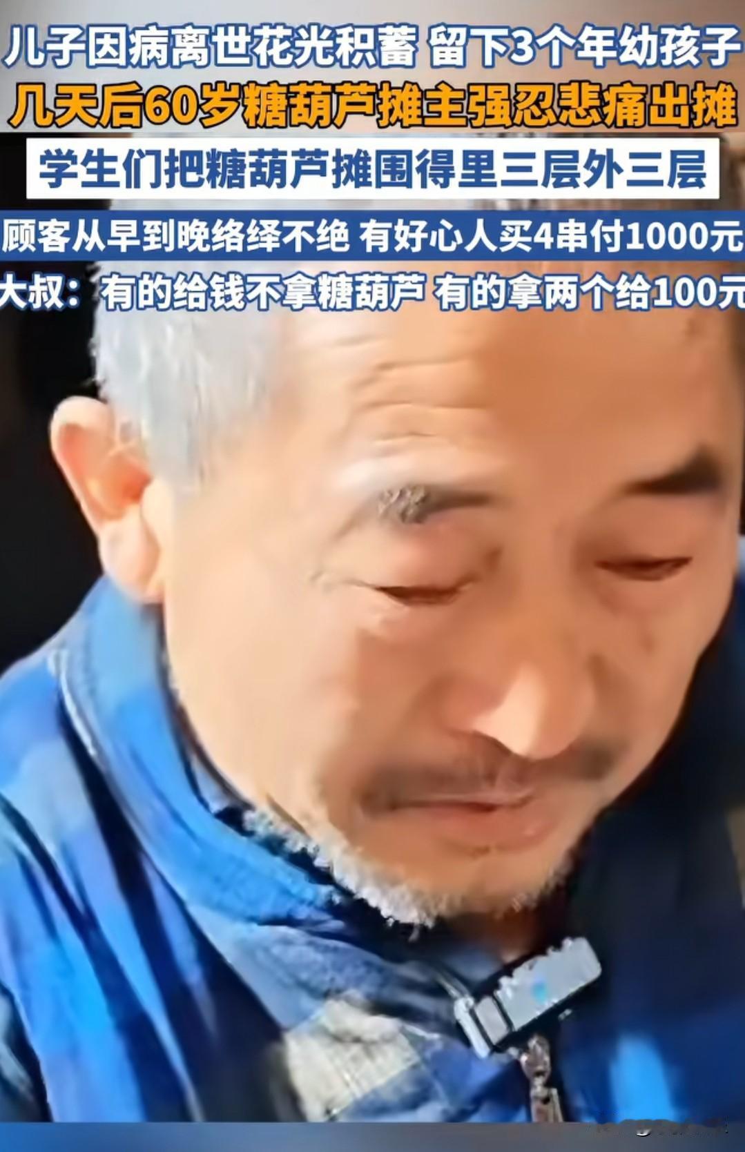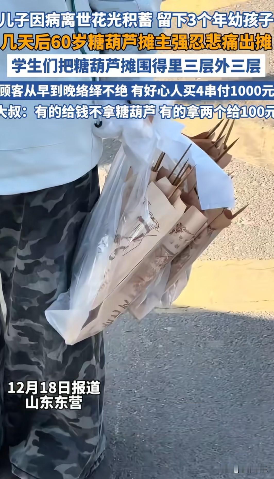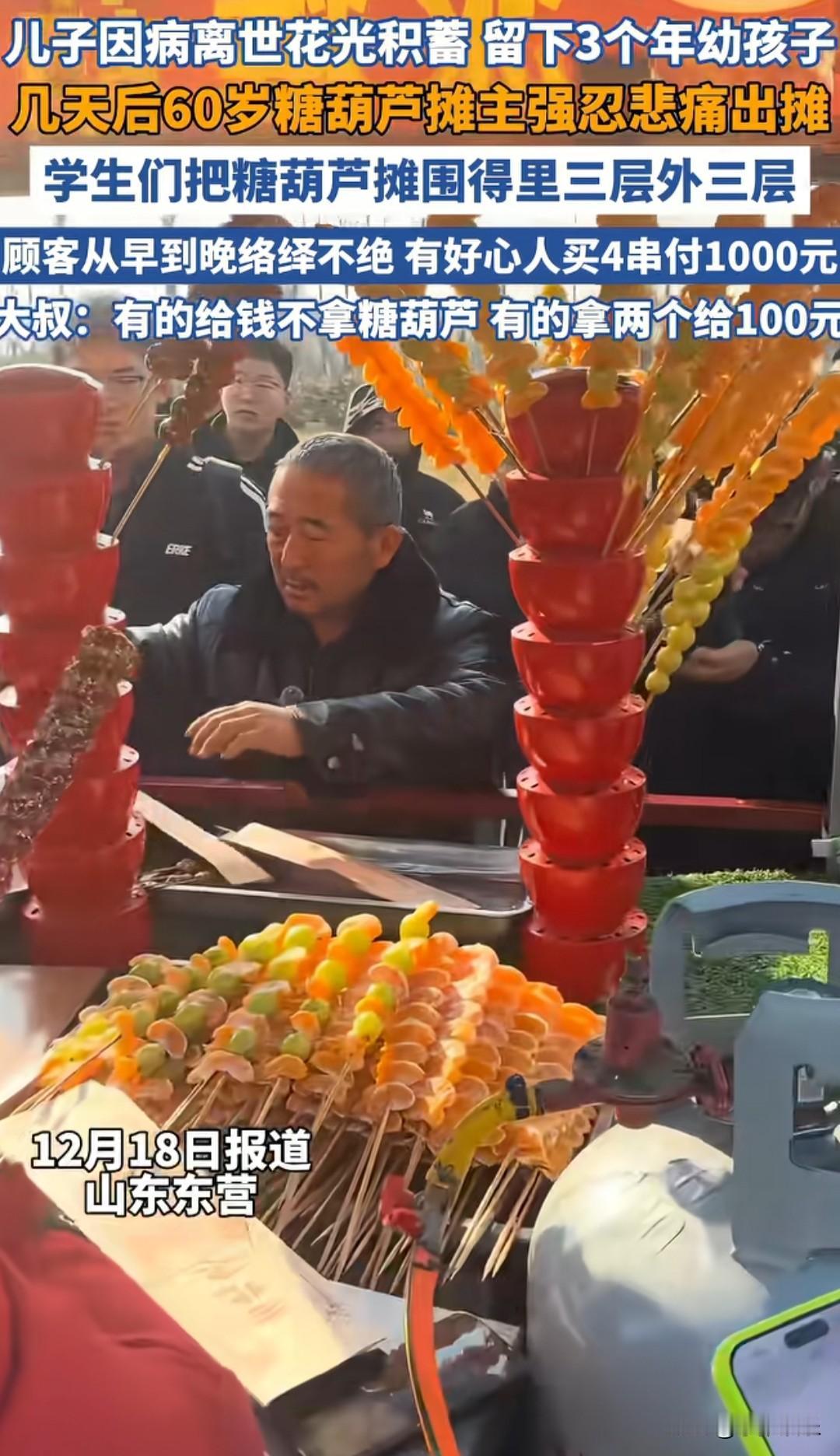 寒冬的街头,冷风卷着落叶打旋,山东东营的一个街角,60岁的张大叔(化姓)守着自己的糖葫芦小摊,通红的山楂裹着晶莹的糖衣,在暮色里透着一点暖。 很少有人知道,这个佝偻着背、手脚麻利的老人,刚扛过人生最沉重的一道坎。不久前,大叔的儿子因病离世,为了给儿子治病,家里花光了所有积蓄,还欠下一笔外债。而他的身后,还有三个年幼的孙子孙女等着吃饭、上学。 悲伤像一块巨石压在心头,可日子还得继续。大叔思来想去,拾起了自己年轻时的手艺——做糖葫芦。没有本钱租店面,他就推着一辆旧三轮车,每天早早出门,在街头巷尾叫卖。一串糖葫芦卖3块钱,挣的都是血汗钱,却是支撑这个家的唯一希望。 大叔的故事,不知被哪个路过的学生悄悄传了出去。 没想到,第二天一早,他的小摊前就排起了长队。 有人走到摊前,扫码付了1000元,只拿走4串糖葫芦,大叔慌得直摆手,对方却笑着说:“叔,您拿着,给孩子买点好吃的。”有人塞给大叔100元,拿起两串糖葫芦就匆匆离开,连找零都来不及要。还有人干脆放下钱,摆摆手说“不用拿糖葫芦”,转身就消失在人群里。 学生们放学了,一群孩子围过来,叽叽喳喳地买走了好多串;上班族路过,特意绕路过来,多付的钱够买十几串;附近的商户也提着袋子过来,把剩下的糖葫芦全包圆了…… 小小的糖葫芦摊,被善意围得里三层外三层。寒风依旧凛冽,可大叔的眼眶,却一次次被暖意焐热。他握着皱巴巴的钞票,手都在发抖,嘴里反复念叨着:“谢谢,谢谢大家……” 一串3块钱的糖葫芦,串起的不只是山楂和糖衣,更是一座城市的温柔与善意。 我们总说,生活很苦,可总有一些不期而遇的温暖,像一束光,照亮那些艰难前行的路。寒冬会过去,春天会来,而这份善意,会和糖葫芦的甜味一起,留在这个冬天的记忆里,滚烫而明亮。