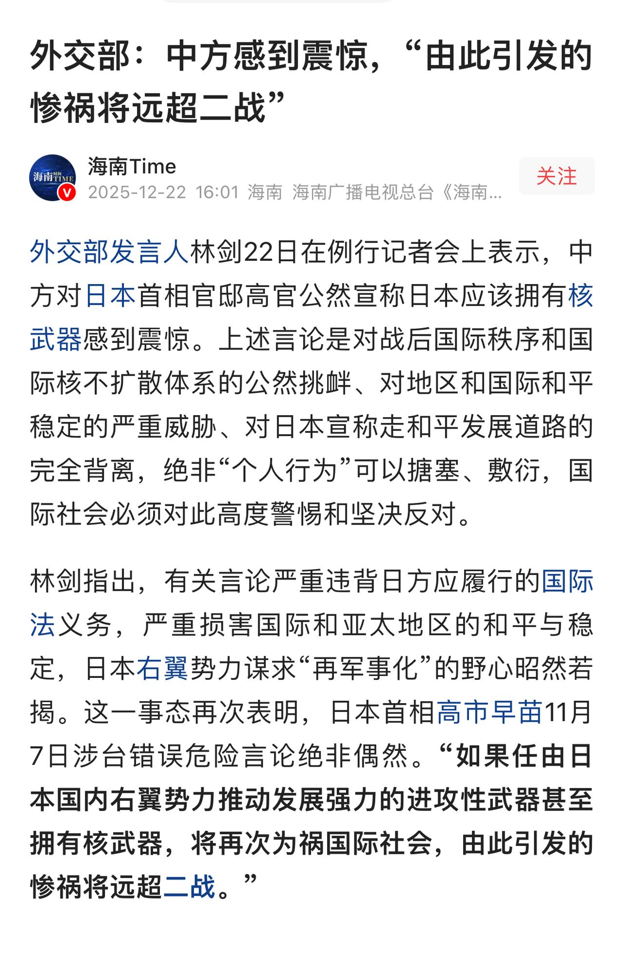 外交部发言人林剑22日发话了:日本有高官跳出来公开说“日本该拥有核武器”,这话说得太过分了!中方表示极度震惊。这哪是“个人言论”?这是明晃晃地挑衅战后国际秩序,砸国际核不扩散体系的场子,拿地区和平当儿戏。你说你要走和平发展道路,转头就鼓吹核武,这不是自打嘴巴吗? 林剑直接点明:这种话不是随便说说,背后是日本右翼势力推动“再军事化”的野心已经藏不住了。从高市早苗前几天拿台湾说事,到如今有人公然叫嚣拥核,根本不是偶然,是一条黑线串着的危险信号。要是放任这帮人搞下去,发展进攻性武器、甚至真去碰核弹,那后果不堪设想——搞不好又要重演二战那样的灾难,祸害的不只是亚洲,是整个世界! 中国警告得很清楚:这事不能糊弄过关,国际社会必须瞪大眼睛、坚决反对。日本别以为换个说法就能蒙混过关,历史的教训就在眼前,谁想翻篇,全世界都得盯着!