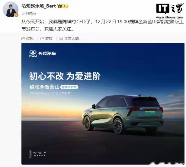 汽车民生 从今天开始,我就是魏牌的CEO |车圈人事车圈里,车企很少公开官宣人事任免,大多数是任免文件流出或者知情人报料,相关人事变动才浮出水面。然而,这哥不按套路出牌,在既不对外官宣,也没人报料的情况下,他在个人账号选择了官宣自己:从今天开始,我就是魏牌的CEO了。有意思吧!他同时透露了魏牌全新蓝山智能进阶版上市发布会的时间。官宣自己的人是赵永坡。在汽车民生看来,赵永坡打破常规的举动,应该是为了魏牌的发展,他官宣自己后,就可以正当名顺地为魏牌代言。在这个人人都是自媒体的时代,车企CEO利用个人账号发言,可以抵得上很多个自媒体账号,节省钱是一方面,影响力、可信度才是车企最看重的。如长城汽车集团的魏总,最近两年他走向前台,用个人流量赋能长城汽车发展,取得的成就有目共睹。长城系的高管,利用个人账号代言,应该是长城汽车集团发展的一个重要趋势。那些还躲在幕后的高管们,要醒醒哦!随着赵永坡履新,自2016年魏牌成立以来,他成为了该品牌的第九任掌舵人。赵永坡的前任是冯复之,曾以“休假”的名义淡出,目前去向不明。冯复之是长城汽车从外部引入的高管,其曾在索尼、苹果、三星、小米等企业负责零售业务,之后又在理想汽车、小鹏汽车等车企任职。坊间有说,赵永坡其实不是现在履新的,之前他就在魏牌CEO岗位上履职快半年了。现在看来,赵本人其实在魏牌CEO这个位置上干了至少半年以上。赵永坡是典型的长城“自己人”,拥有超过20年的汽车技术研发经验,被业内认为是长城体系内成长起来的“技术干将”。其于2000年左右加入长城汽车,曾担任长城汽车技术中心副总经理,主导整车平台、下车体、性能和底盘研发等工作。 2023年11月1日出任哈弗品牌总经理。