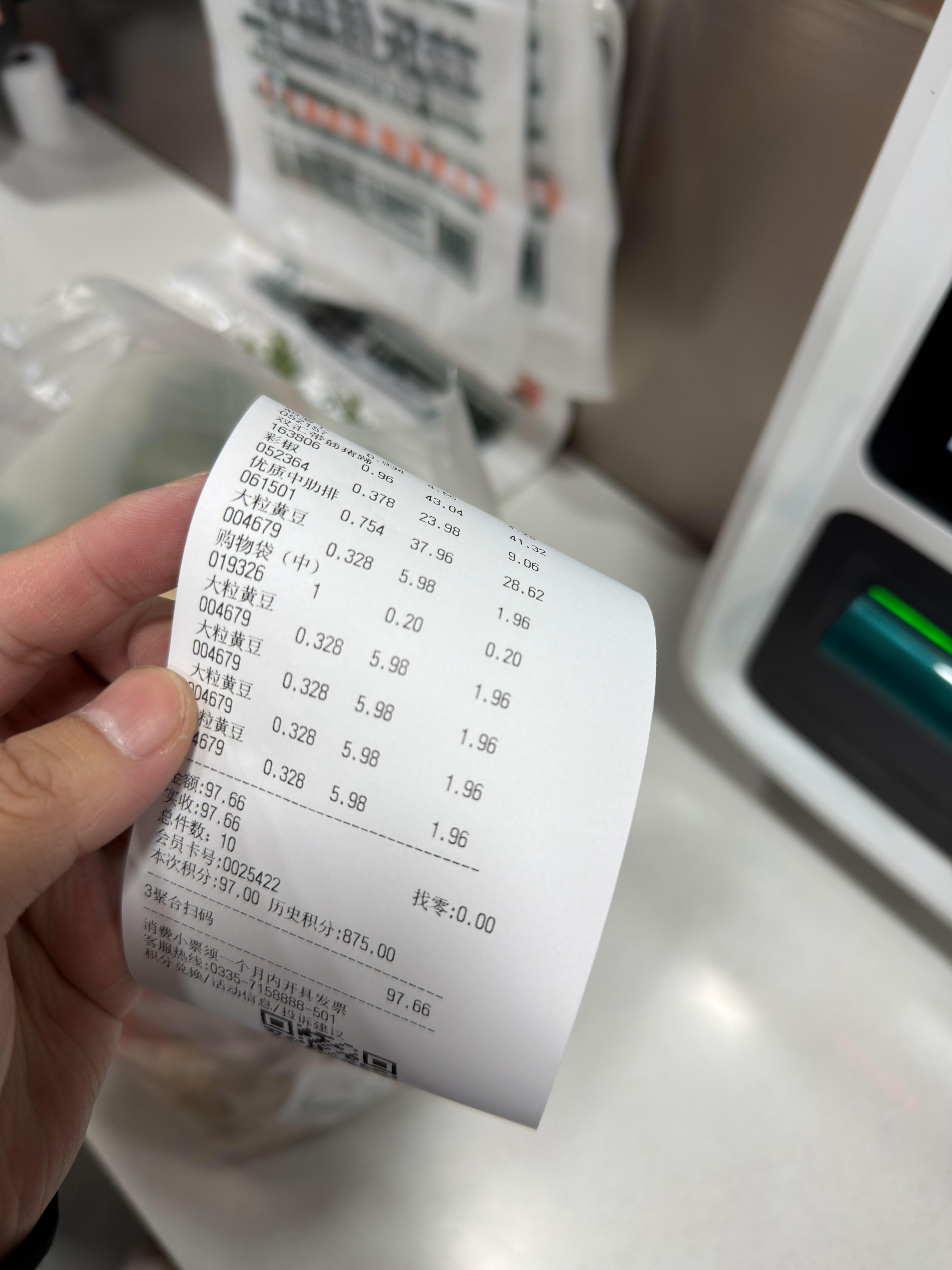 大家去超市一定要养成看小票的习惯,刚差点被多扣个鸡腿钱。在自助结账机结的账,结完的商品放桌子上对着扫码机又一顿连扫。还好及时找了工作人员,挽回了7.84元的巨款。