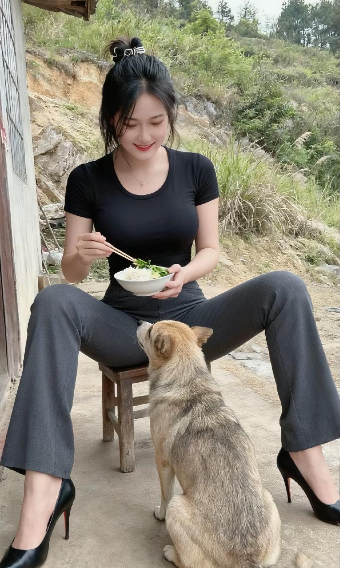 冬日雪景中的时尚穿搭,黑色羽绒服搭配高跟鞋,尽显优雅与温暖。