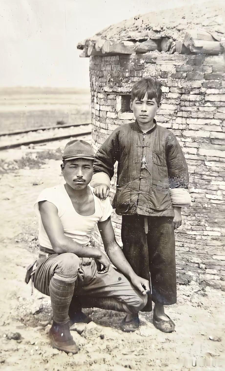 这张照片耐人寻味,照片中的日本鬼子蹲在地上,穿着背心,打着绑腿,嘴上留着小胡子,眼睛眯眯着,看着表情就带着一股狠劲,可是不知为什么,这个穿的破破烂烂的男孩,居然把手搭在了他的肩膀之上,脸上也没有什么表情,可以肯定的是,照片是日本鬼子拍摄下来的,他们拍摄这张照片的目的是什么,恐怕只有他们自己心里最清楚,这个男孩最后的命运如何,真是有些不敢想下去!