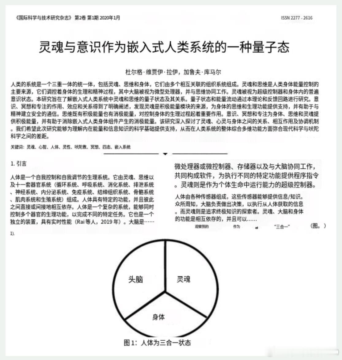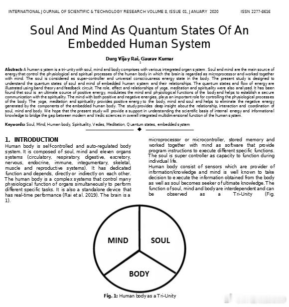 灵魂与心灵作为人类嵌入系统的量子态人体系统是一个由灵魂、心智和身体组成的三元整体,包含多个相互关联的器官系统。灵魂和心智是控制人体生理和精神过程的主要能量来源,其中大脑被视为微处理器,与心智协同运作。灵魂被认为是人体内的超级控制器和宇宙意识能量状态。本研究旨在理解人体系统中灵魂和心智的量子态及其相互关系。