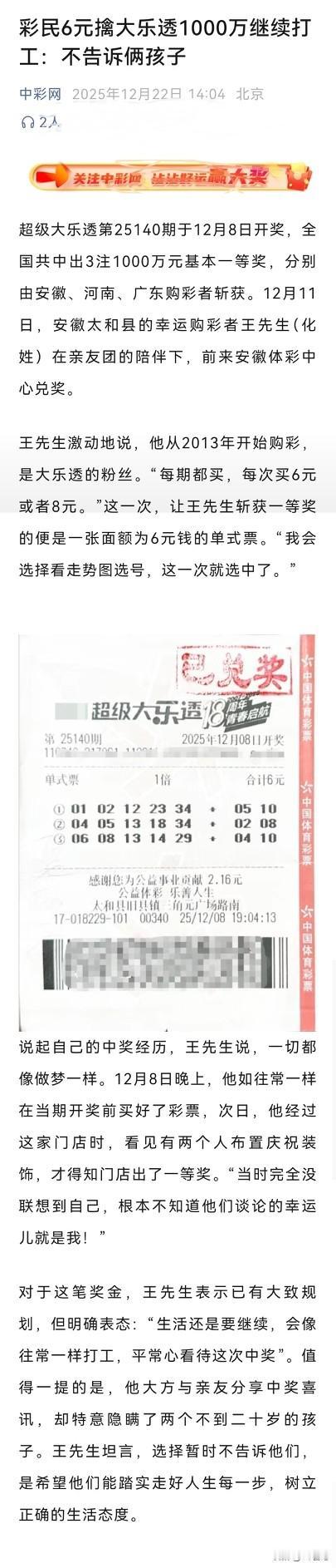 故事编的漏洞百出! 选择看走势图选号就中了一等奖?每次开奖有毛线走势规律,自欺欺人而已! 【对于这笔奖金,王先生表示已有大致规划,但明确表态:“生活还是要继续,会像往常一样打工,平常心看待这次中奖”。】中了千万大奖,还能淡定的继续打工?你们信吗? 【中奖者大方与亲友分享中奖喜讯,却特意隐瞒了两个不到二十岁的孩子。王先生坦言,选择暂时不告诉他们,是希望他们能踏实走好人生每一步,树立正确的生活态度。】这就更扯犊子,告诉了亲友,不告诉儿子,儿子傻啊!亲友迟早不得漏底么?故事是真能瞎掰