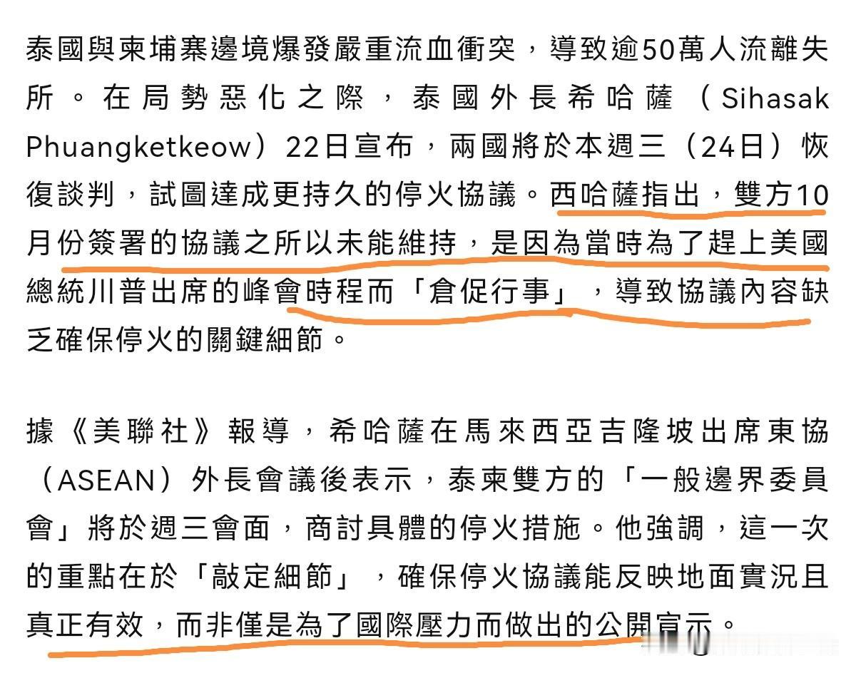 中国出手之后,泰国明确表态,这一次希望与柬埔寨好好的谈!泰国的表态,估计让特朗普感到挂不住了!12月22日,根据岛内媒体报道,泰国外长希哈萨22日宣布,两国将于本周三(24日)恢复谈判,试图达成更持久的停火协议。希哈萨指出,双方10月份签署的协议之所以未能维持,是因为当时为了赶上美国总统特朗普出席的峰会日程而“仓促行事”,导致协议内容缺乏确保停火的关键细节。 希哈萨解释,当时的协议是为了确保能由特朗普见证而仓促达成,因此缺乏足够的执行机制。这一次的重点在于“敲定细节”,确保停火协议能反映地面实况且真正有效,而非仅是为了国际压力而做出的公开宣示。很显然,在我们出手之后,泰国的这一番表态,明显会让特朗普有些挂不住。 为什么这样说呢?如果说上一次停火,美国总统特朗普确实发挥了影响力,以至于两国不得不给特朗普一个面子的话。那么这一次,泰国则想要传递的信息是,泰国不会在卖美国这个面子,泰国不会迁就美国了。这对于美国意味着什么呢?这意味着特朗普奉行的“交易式斡旋”在泰柬冲突中失效了。 泰国明确强调“并非仅是为了国际压力而做出公开宣示”,这就是告诉美国,美国的那种施加影响力的方式,作为当事国泰国不认可,而这事实上就是在排除美国的主导地位,削弱美国的影响力。现在泰柬纠纷,事实上正在做穿梭外交的是中国,而不是美国。这样的局面,对于志在竞逐诺贝尔和平奖,意图彰显个人能力的特朗普而言,这不得不说是一个大尴尬。