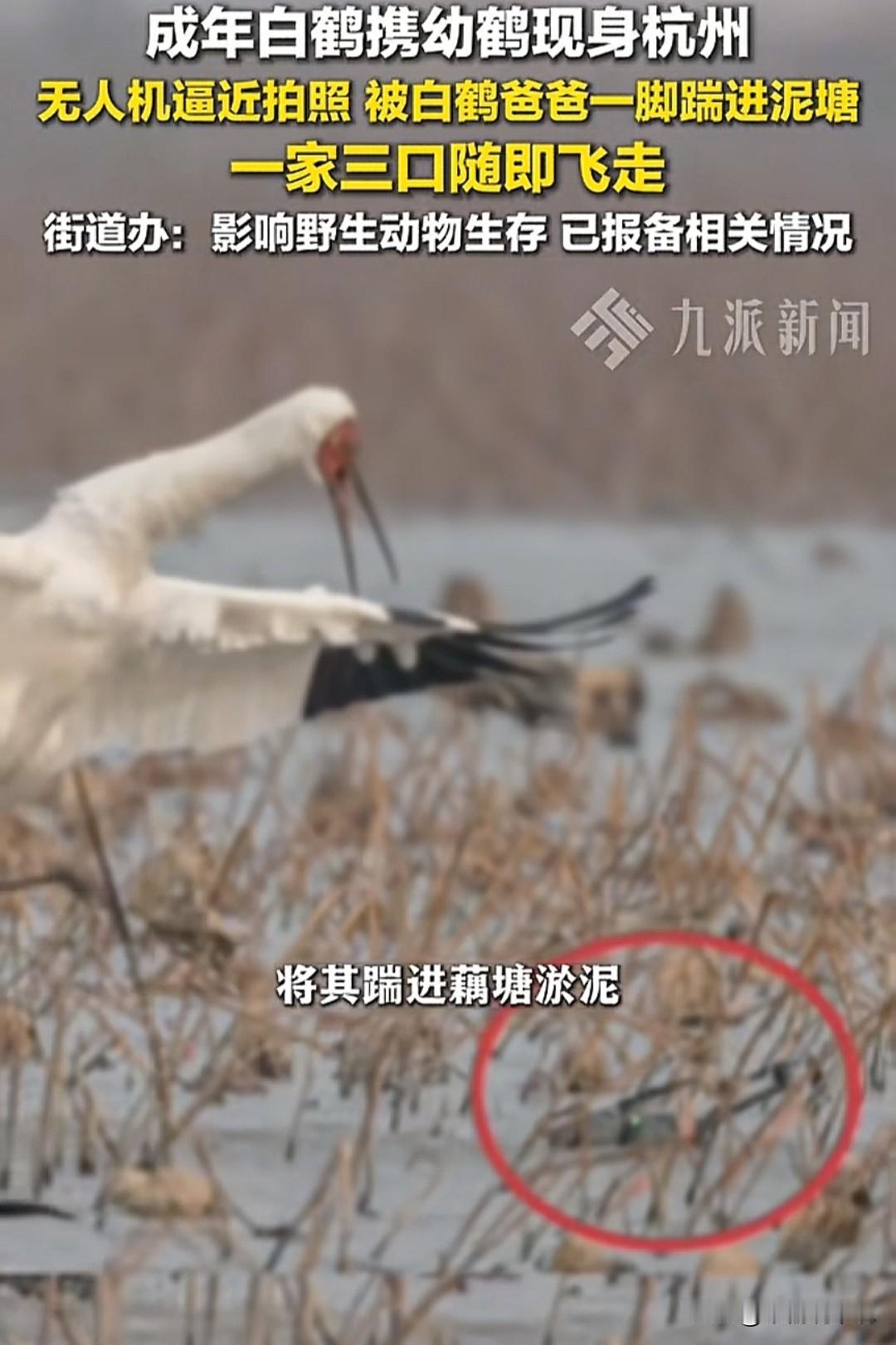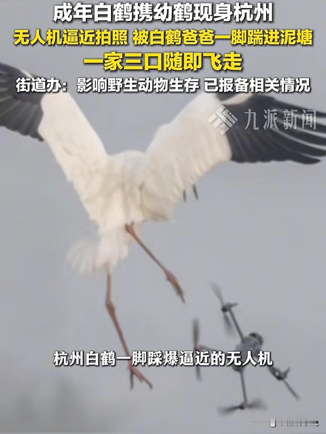 鸟都知道边界感,人却不知道!12月21两只成年白鹤携一只幼鹤出现在了浙江杭州的余杭南湖,吸引了不少鸟类爱好者的关注,甚至有人动用了无人机拍摄! 但是其距离把握得有待商榷,目击者称无人机起初距离白鹤大概有十来米远,后来逐渐逼近到只有一米的样子,这时其中一只白鹤暴起,一脚把无人机踹进泥塘! 有网友说或许这三只白鹤是来探路的,这一飞走就很难再回来了!想必这只白鹤认为无人机影响到了它们的安全和生存,随即这一家三口飞离了这里!