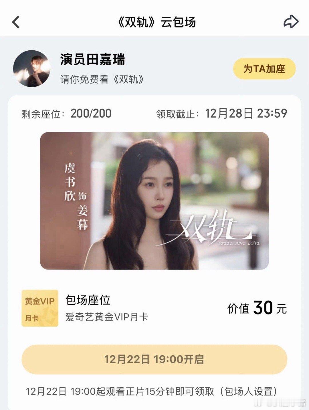 田嘉瑞云包场虞书欣《双轨》!田嘉瑞包场双轨