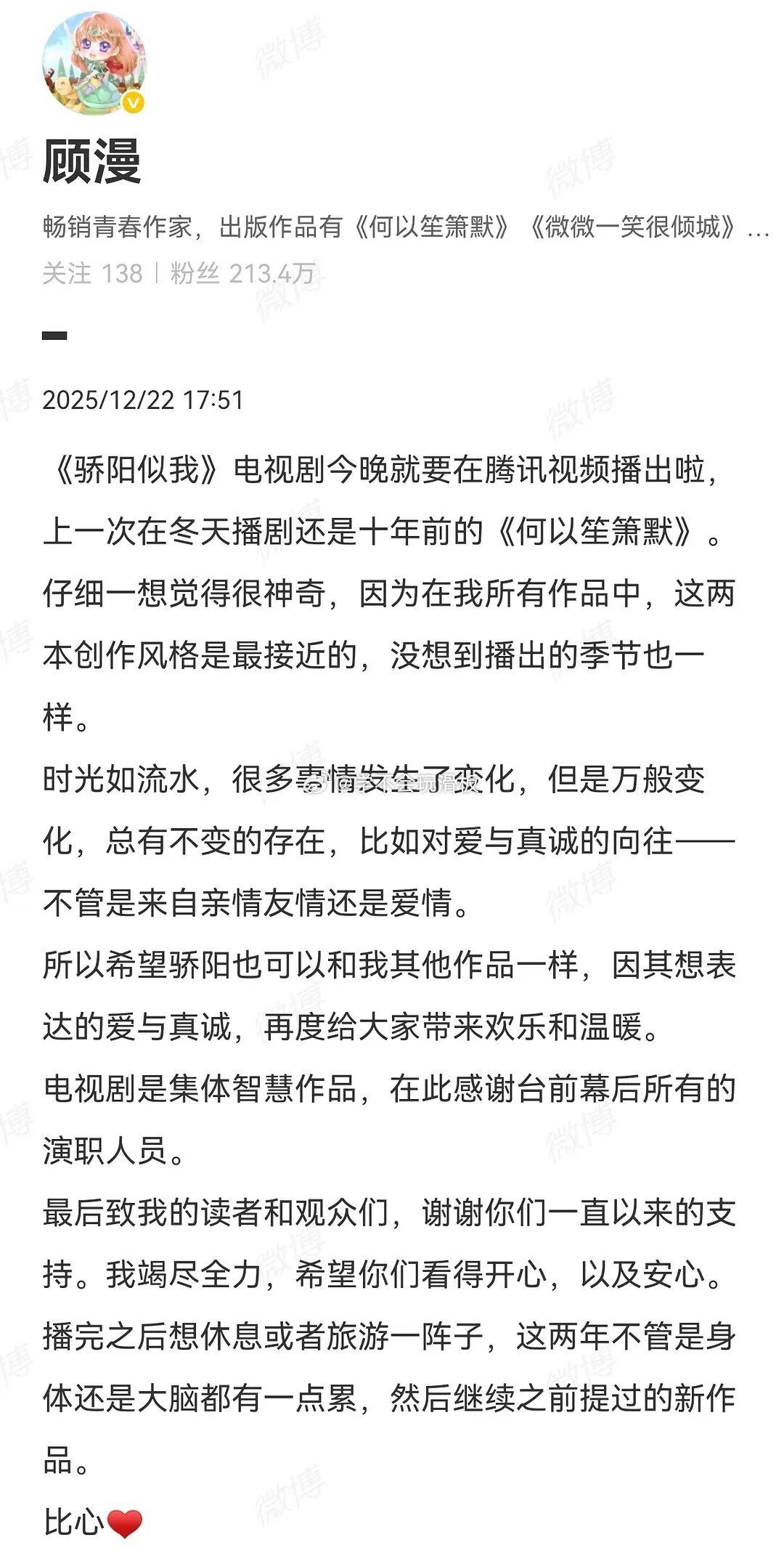 宋威龙、赵今麦《骄阳似我》首播六广开局,顾漫都发文亲自打call了,刚看了一会儿