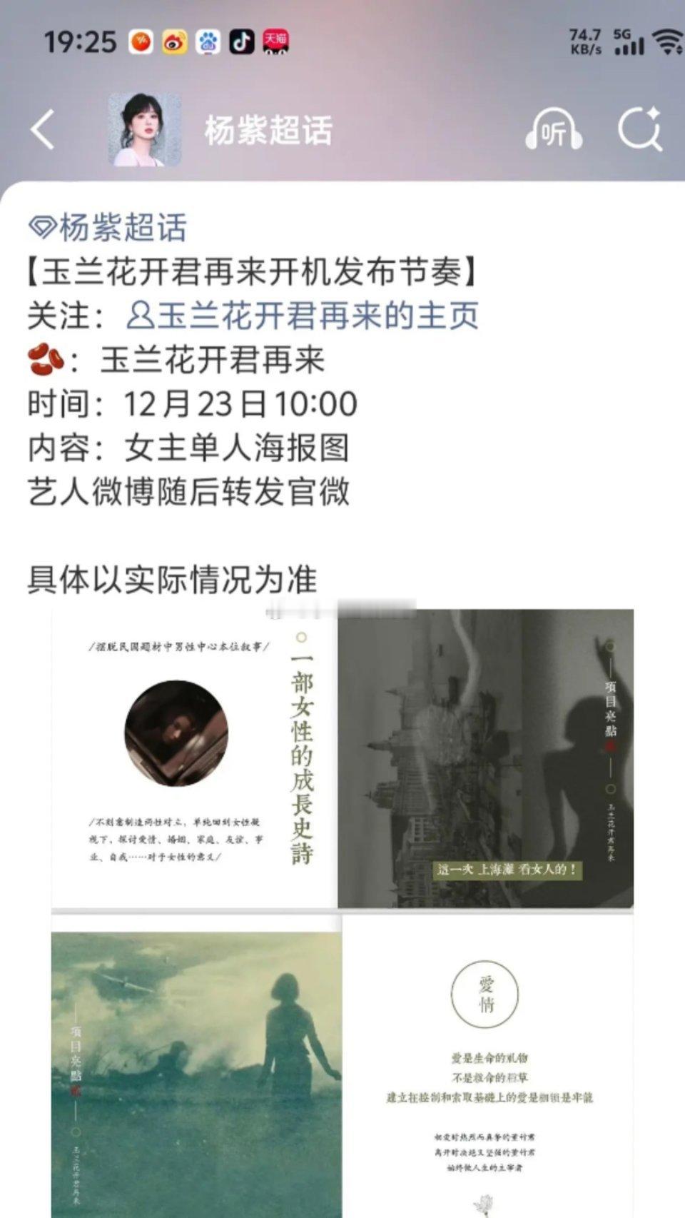 杨紫《玉兰花开君再来》要开机了,会发布女主单人海报图。