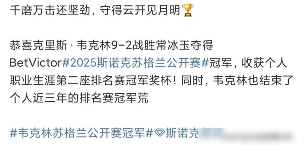 我在输了第一局后,心有点慌了,尝试着扳回比分,接着就两连鞭领先。这是常冰玉在决赛惜败韦克林后的赛后感言,听得出小伙子这次输得确实有点不甘心。 其实整场球的转折点就在第四局,当时他领先30多分,结果因为母球走位的一点偏差,导致大角度红球没打进。我觉得这种“关键球”失误对心态的打击是毁灭性的,直接导致他后面越打越急。 他自己复盘时也挺坦诚,说后面出现了不少简单失误,纯粹是因为经验不够,没能压住心火。这种在赛场上和自己较劲的状态,大概是每个年轻选手都绕不开的坎。 最让人感慨的一个细节是,他承认打球时脑子里竟然浮现出了奖杯的画面。决赛的诱惑力确实大,可一旦心思跑到了结果上,手底下的动作就容易变形。 我感觉赵心童复出即夺冠这件事,无形中也给了他挺大压力,总想着自己也能顺势拿一个。这种“同辈压力”有时候是动力,但在决赛这种节骨眼上,反而成了压垮节奏的包袱。 以前前几轮能一直赢,是因为想得少、只管冲,到了决赛反而因为想太多而“栽了筋斗”。这就是竞技体育的残酷之处,技术往往不是唯一的决定因素。 不过能把这次失利看成“必修课”,说明常冰玉的心理建设还在进行中。输球不可怕,能看清自己是因为分神而输,下次站在决赛桌前,他应该就知道该往哪盯着看了。