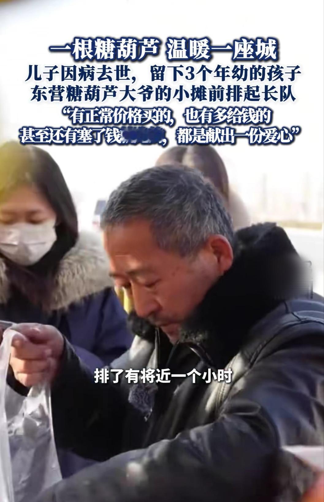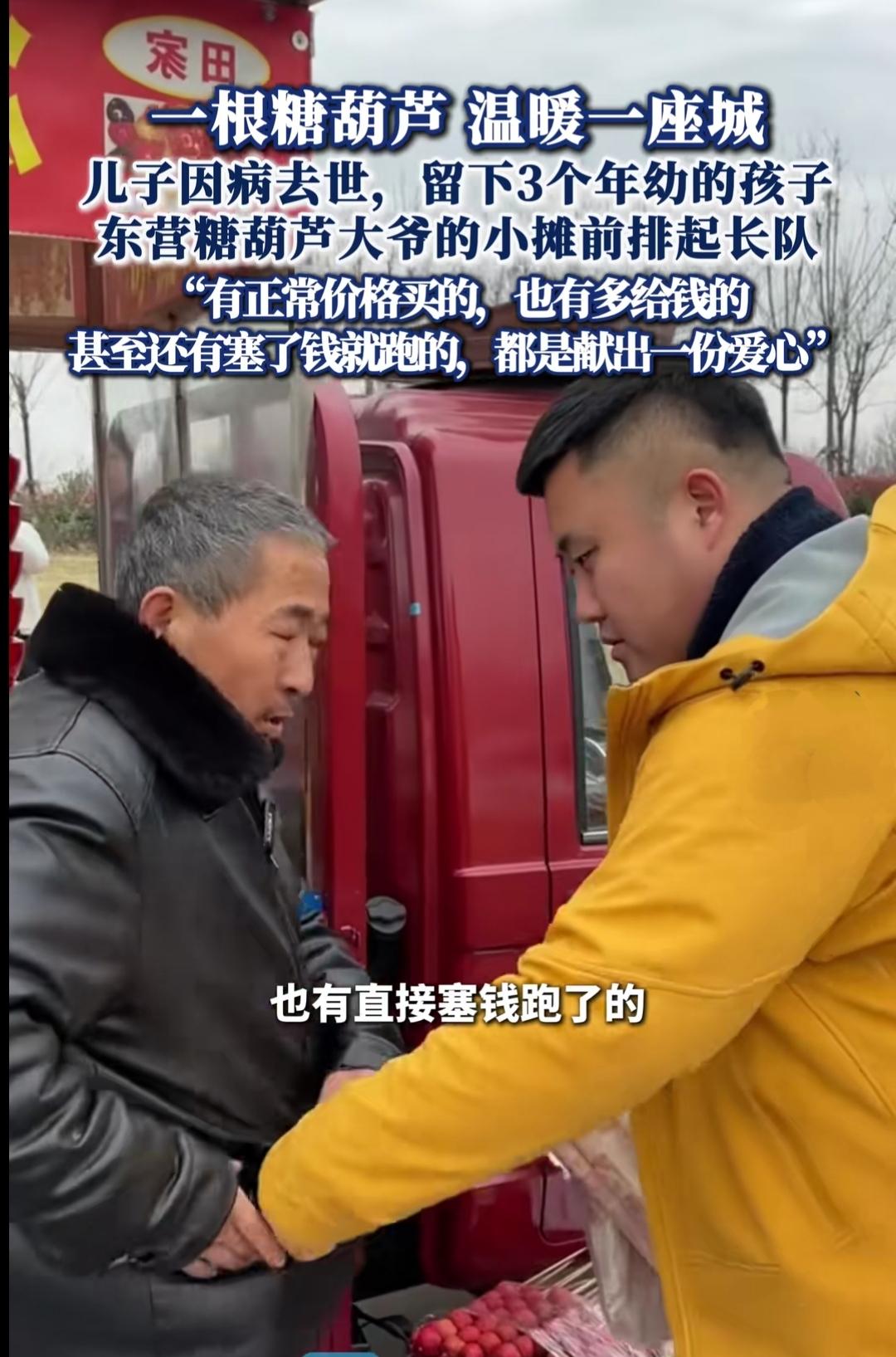 山东东营的冬天,寒风刮得人缩脖子,可街角一个糖葫芦小摊前,却排起了长长的队伍。有人裹着厚外套搓着手等,有人一次买好几串,甚至有人放下钱就走,只说“大爷不用找了”。头发花白的摊主大爷,双手冻得通红,指缝里还沾着糖霜,却一边麻利地打包,一边反复说着“谢谢”,这热闹的背后,藏着一个让人心酸的故事。 原来大爷的儿子因病离世,留下三个年幼的孙辈,老伴身体不好常年服药,全家的生计全压在他肩上。本该安享晚年的年纪,他却每天天不亮就起床熬糖、串山楂,在寒风里一站就是一整天,用一串串酸甜的糖葫芦,为孩子们撑起生活的希望。 网友得知真相后,特意赶来支持,有人说“天气再冷,也想为大爷添份力”。寒风刺骨,可摊位前的人情味却格外滚烫。一串糖葫芦,串起的不仅是酸甜的滋味,更是陌生人的守望相助,是困境中不低头的担当。原来最冷的冬天,也会被人心的温暖焐热,生活虽有艰难,但总有人用善意,把日子过出了甜。