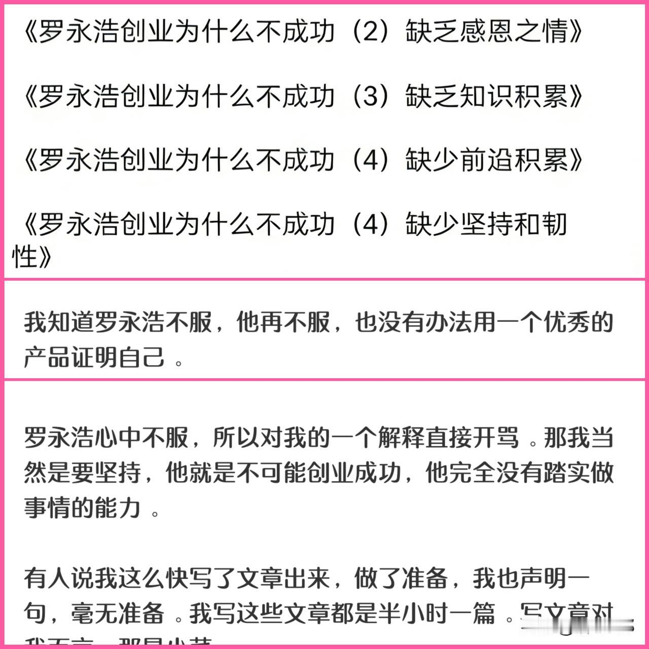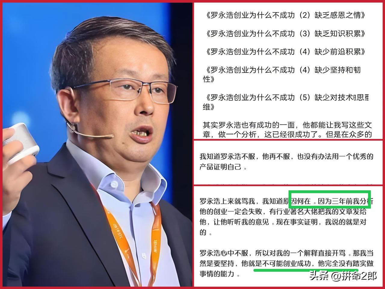 项立刚 揭开 罗永浩 怼他的根源: “他再不服,也没有办法证明自己。” “事实证明,罗就是不可能创业成功,他完全没有踏实做事情的能力,我分析他的创业一定会失败是对的。” 项说:早在3年前就写过文章分析罗失败的原因,网上分析罗失败经历的文章并非临时准备,是3年前就发表过,罗也看过,心中不服,所以逮着机会就直接开骂! 这么看来,“罗立口水战”的雷💣是早就已经埋下的了,这一次只不过是因为“某信网络”把导火索引燃罢了。 这颗“雷”到最后会在哪里引爆,是爆到罗桑这边,还是项这边? 也不知道出了名以“骂”占据热搜榜的罗桑,此刻是什么想法,还能不能骂得动? 能否利用这颗“雷💣”报3年前的“失败言论”之耻? (取材:微博)