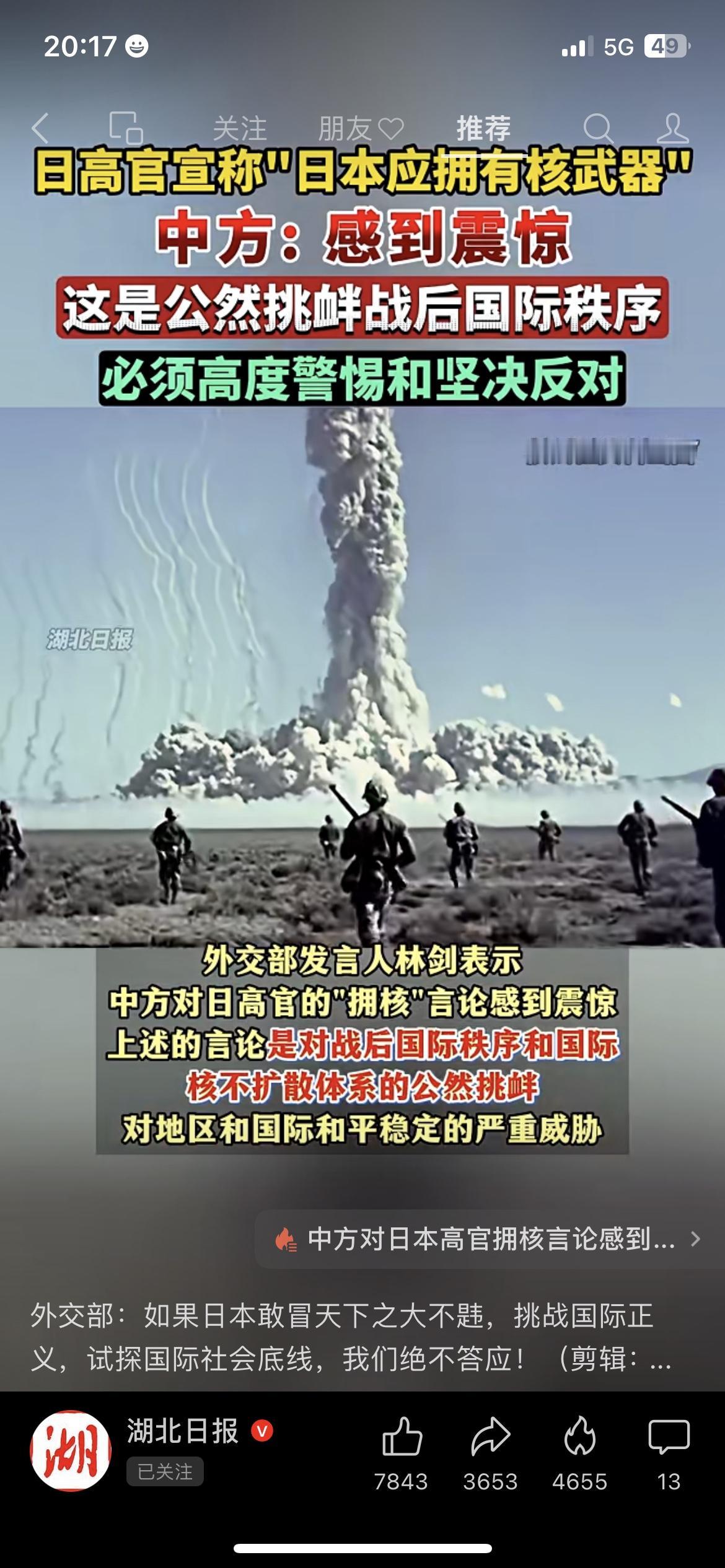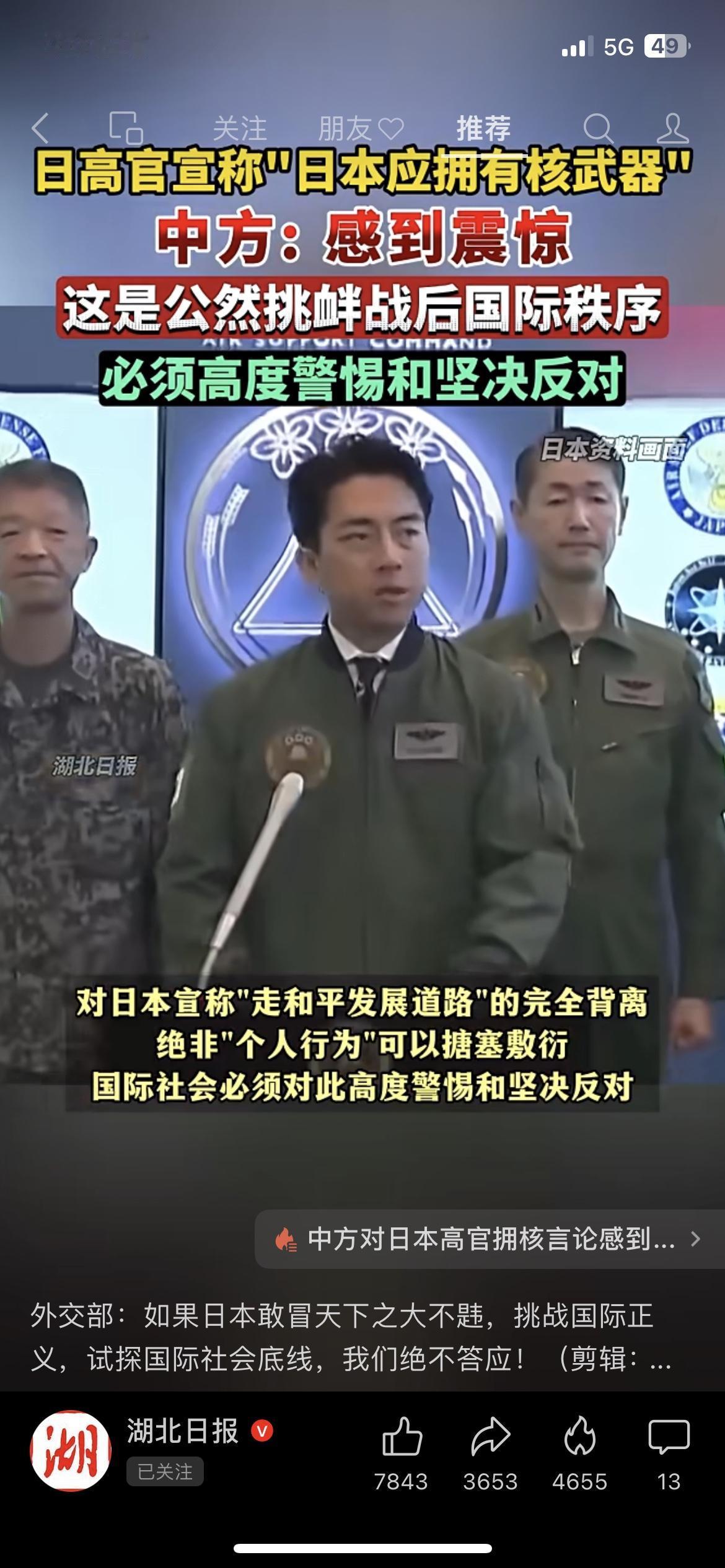 日本高官叫嚣拥核?中方硬气回应,这3点让所有人警惕! 12月22日外交部记者会爆出大消息!日本高官公然喊着“日本该拥有核武器”,防卫大臣还放话讨论“无核三原则”不排除任何选项,这操作简直离谱! 先说说这“无核三原则”,是日本1967年定的底线:不拥有、不制造、不运进核武器,是战后和平发展的根基。现在他们想撕毁这规矩,就是公然挑战二战后的国际秩序! 更可怕的是,日本不是没能力造核武——手里攥着巨量核原料,核技术更是顶尖,真要突破底线,东亚和平直接悬了!不光咱们中国震惊反对,韩国等周边国家也急了,纷纷表达担忧。 外交部发言人林剑直接亮明态度:这是对核不扩散体系的挑衅,日本敢冒天下之大不韪,我们绝不答应!中国的态度就是这么刚,坚决守护地区和平! 👉 你觉得日本突然炒作拥核,背后藏着什么心思?评论区聊聊你的看法!日本核武争议 日本要拥核