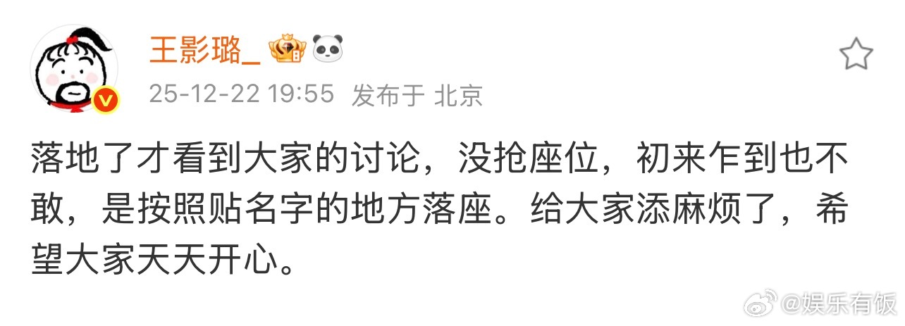 王影璐 没有抢座位也不敢王影璐否认抢座位传言 发文回应网传抢座位一事“落地了才看到大家的讨论,没抢座位,初来乍到也不敢,是按照贴名字的地方落座。给大家添麻烦了,希望大家天天开心。”王影璐