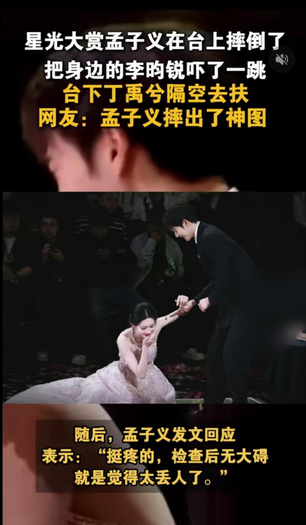 2025年12月21日海口星光大赏,本是群星闪耀的名利场,没想到孟子义的一跤,直接把热搜焊死在“暖心”上。她穿六位数鎏金重工礼服,踩10cm高跟鞋随《尚公主》剧组领最受期待剧集奖,刚踏上台阶就被三米长尾摆绊倒,双膝重重磕在硬地上。 可尴尬瞬间竟成了名场面!她发丝飞扬间单手撑地,鎏金礼服摔成绝美扇面,破碎感拉满却没慌神,起身拍了拍裙摆就笑着上台。更戳人的是身旁人的反应:李昀锐秒速俯身搀扶,差点跟着失衡;白鹿、丞磊立刻回身搭手,下台还紧盯她裙摆叮嘱慢走;连台下丁禹兮都下意识隔空伸手。 孟子义领奖时自嘲“去年今年接连摔,明年一定稳住”,逗笑全场还不忘感谢搀扶的朋友。这场意外让大家看清,内娱从不是只有竞争,更有藏在细节里的善意。摔倒不可怕,被温柔接住才珍贵,这大概就是内娱最动人的样子——星光再亮,也抵不过人与人之间的温暖守望。