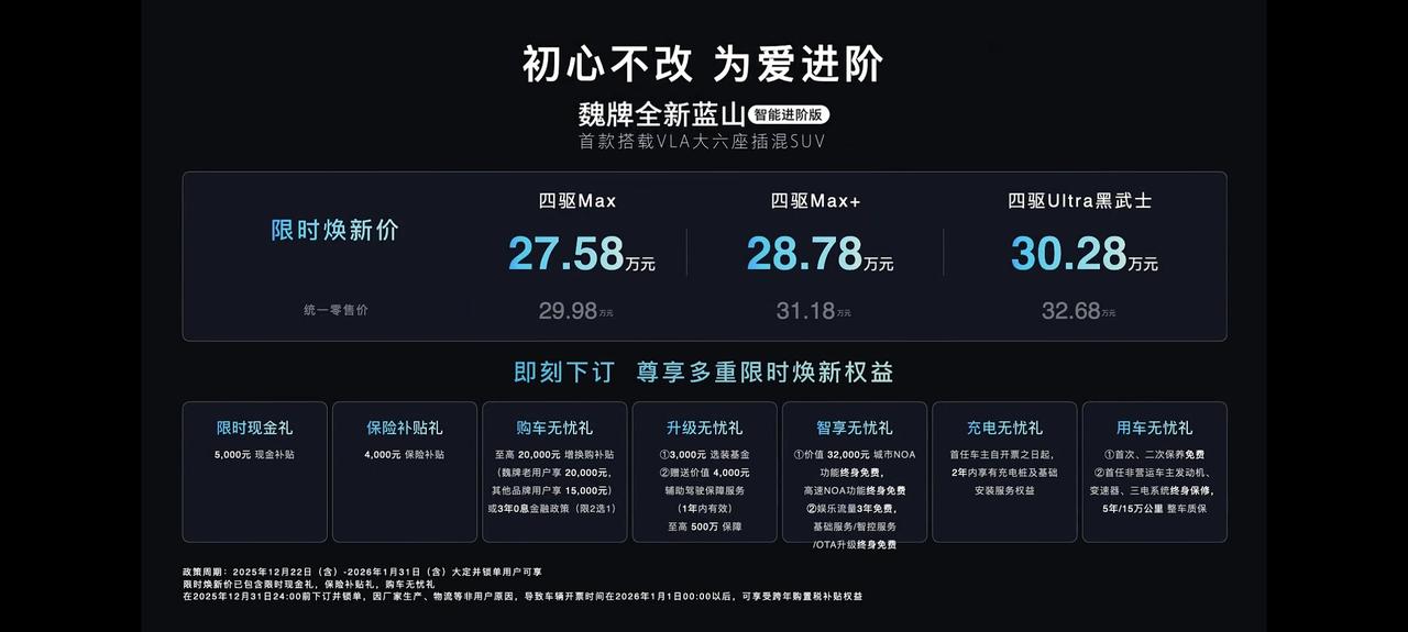 魏牌全新蓝山智能进阶版上市,限时焕新27.58万元起,长城首款搭载VLA的大六座插混SUV,升级了Thor芯片,算力700TOPS,27个感知硬件,拒绝“黑箱焦虑”。 后视镜和车尾增加了辅助驾驶小蓝灯,两挡亮度可调,看过我们的视频都知道,真的特别亮~驾驶界面增加了VLA推理卡片,随时了解车辆的思考,还能通过小魏同学语音控车,主打一个听得懂,看得见。 因为算力提高了,现在还可以根据路况提前预瞄,调整悬挂阻尼,开起来更舒适。魏建军发布会高调“表白”魏牌,称经营好魏牌对于长城,对于自己都非常重要,做高端品牌要耐得住寂寞,要有自信!【来自懂车帝车友圈】