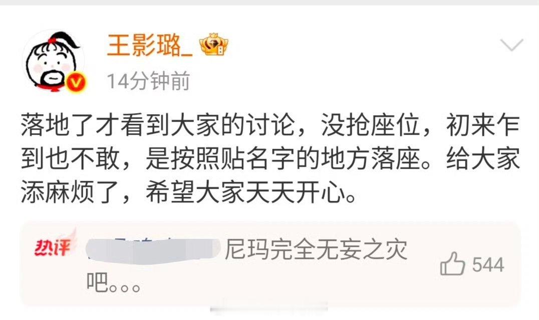 王影璐 没抢座位 王影璐 澄清没抢座位,是按照姓名牌就坐的,也是无妄之灾了