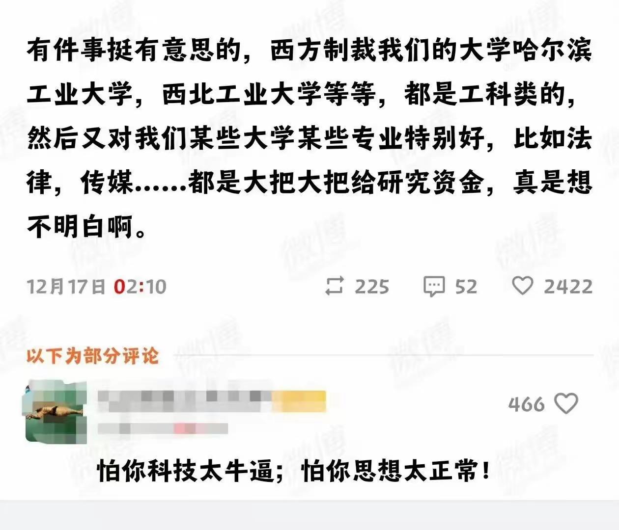 西方一边制裁我们的工科类大学,一边给文科类大学资金扶持,让人百思不得其解,难道西方人神经错乱? 这一看就是不正常的,一位网友对这种现象总结的很到位:说白了就是怕你科技太牛逼,又怕你思想太正常!