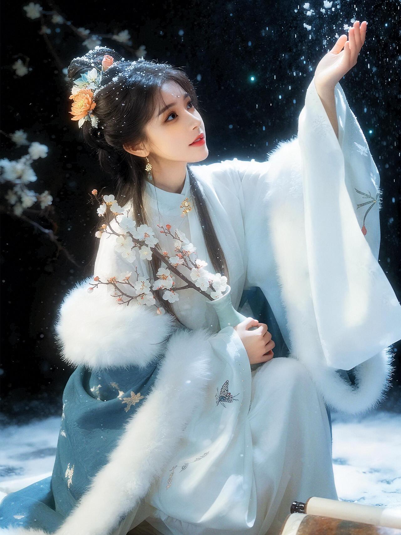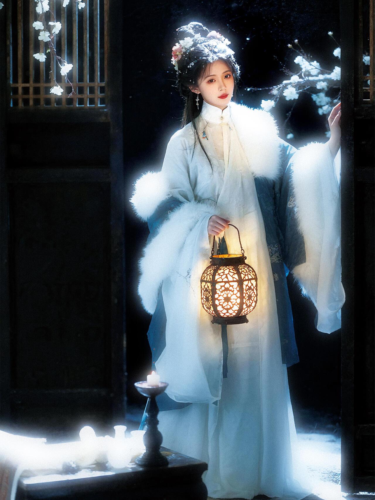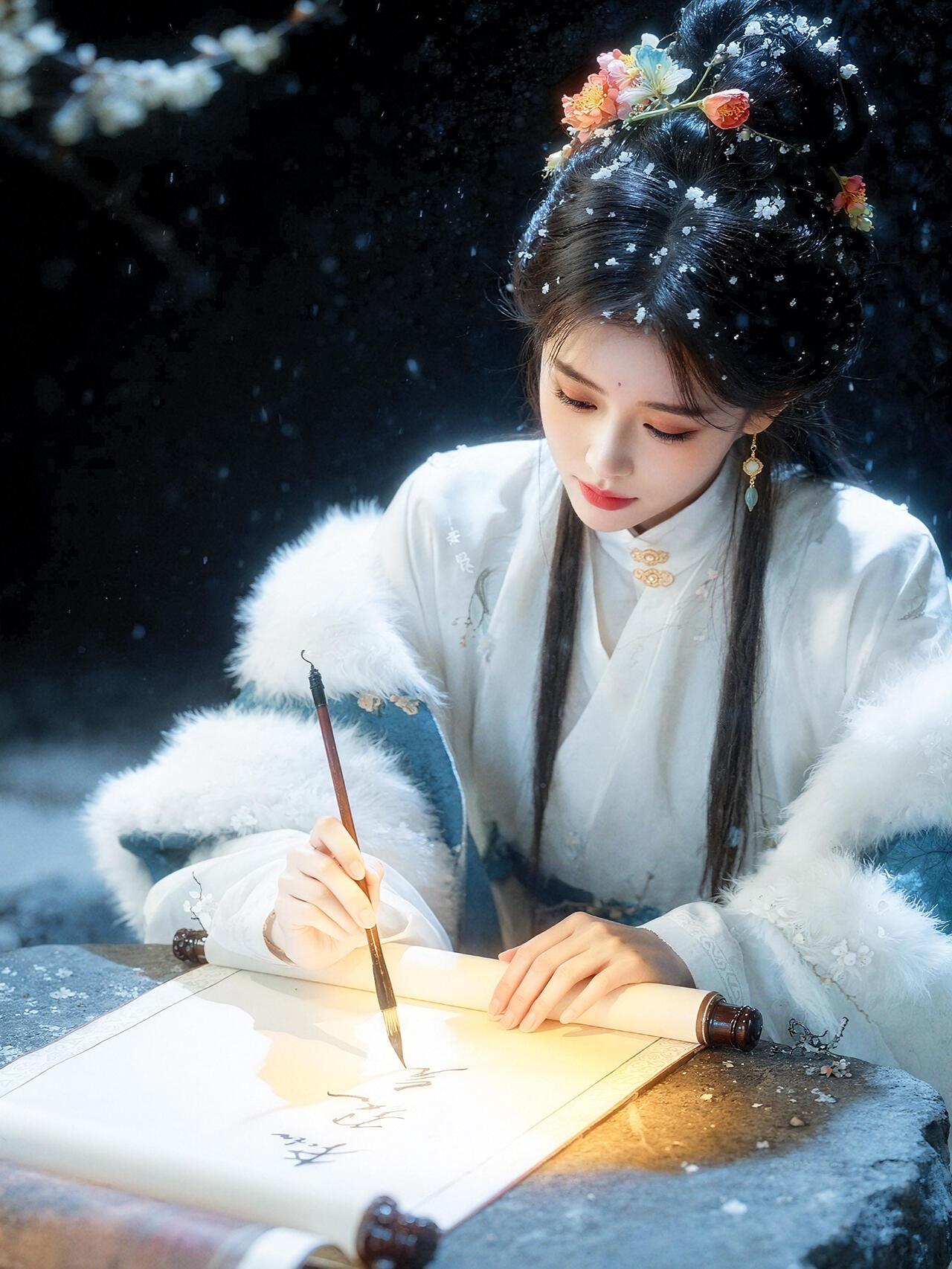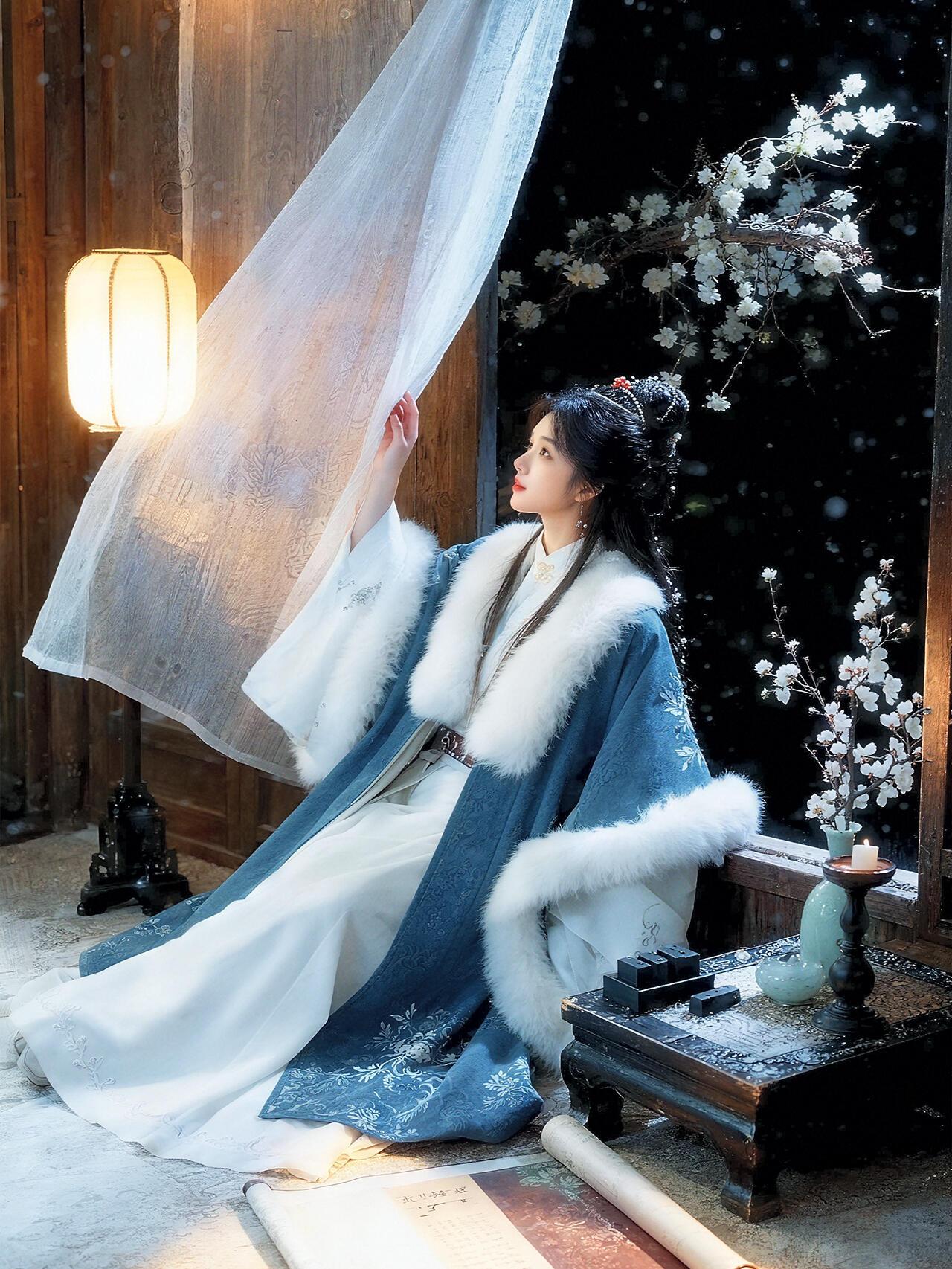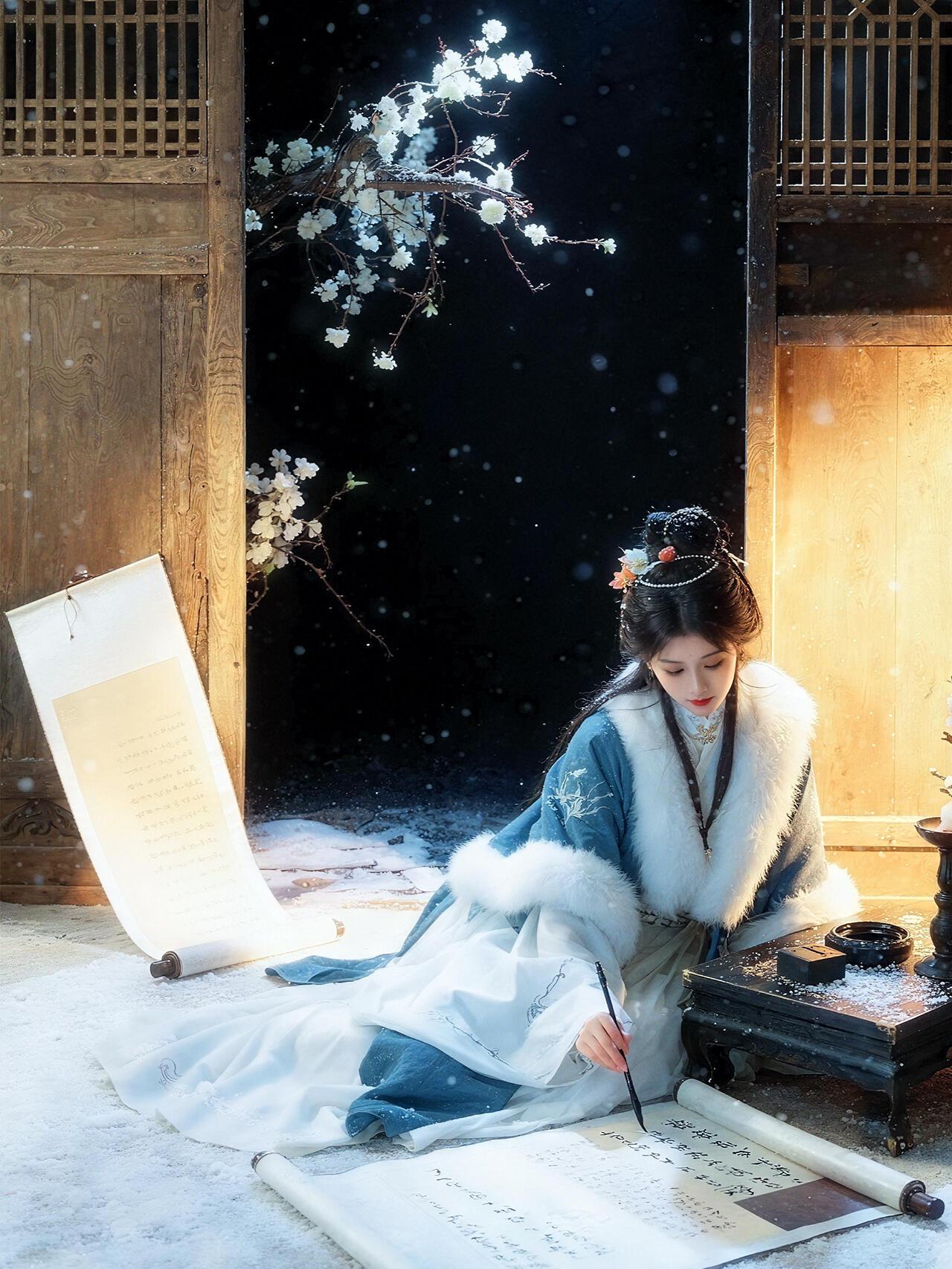 人物的神态刻画尤为细腻,或凝眸望梅,或垂首书写,眼神中流露出的温婉与怅然,贴合了冬雪题材中“孤高却不孤寂”的古典女性气质,避免了古风摄影中常见的“空有其形,未见其神”的问题。 服饰与妆造的搭配贴合主题且细节考究,白色交领汉服外搭蓝底镶毛披风,面料的质感与毛绒的蓬松感形成触感对比,发间的绢花与耳坠的点缀,在素净的整体造型中增添了一抹亮色,既符合冬日的厚重感,又不失古典女子的灵动。妆面的淡雅处理也与主题契合,唇色的暖调中和了雪色的冷冽,让人物的面部神态更具亲和力。