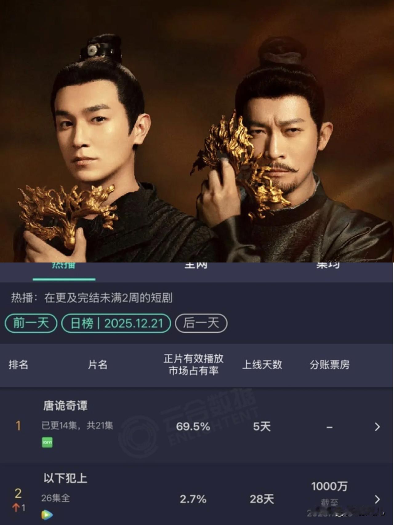 《唐诡奇谭》的热度不及预期。 该剧播出至今,在短剧市场的占比是一日比一日高,昨日占比更是超越过往的中短剧历史占比而来到69.5%。这一成绩,若一只老虎来到了一群羊里,属实是降维打击。然其在“猕猴桃”的热度,在播出的次日达到7889的高度后,随后的几日便再未超过此数值。究其根底,倒不是因该剧的质量不佳,也并未观众不爱看,而是每日播出的集数太短。一日两集的播出,累计时长,掐头去尾,也才堪堪30分钟。这时间,长剧的一半时间都没有。要以这种时常冲热度新高,无异于苛责了,实在太难。从实际的播放效果来看,该剧的成绩是非常漂亮的,其广告招商比起一些大制作的长剧犹有过之,招商效果非常好。而以它目前的播出 热度,同长剧相较,《唐诡奇谭》毫不逊色,且犹有过之。经过几季的播出实绩,唐诡IP宇宙已然大成。这个IP够郭靖宇团队和猕猴桃吃上好久了。 截止今日第一单元“解忧店”已经结束,对该单元的质量是极其满意的,整个剧情下来,编剧没有多少冗余着墨,情节的推进都践行着为故事服务的宗旨。个人认为将其同第三季“长安”的多个单元相比,“解忧店”的质量在前二之列。