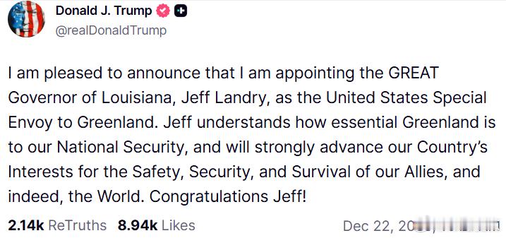 特朗普总统12月22日:我很高兴地宣布,我将任命伟大的路易斯安那州州长杰夫·兰德里为美国驻格陵兰特别特使。杰夫深刻理解格陵兰对我们国家安全的重要性,并将坚定推进美国的国家利益,确保我们的盟友乃至整个世界的安全、稳定与生存。