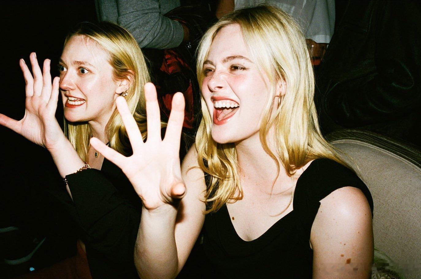 艾丽·范宁和达科塔·范宁姐妹出席《至尊马蒂》首映式映后派对的合照
