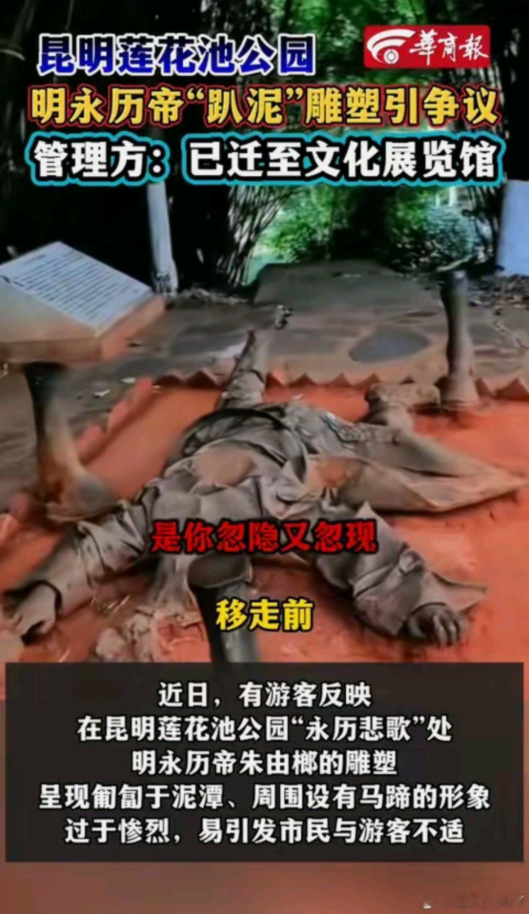 永历帝趴地上的雕塑已经移走。据称原址已经改成绿地。我看这才是成功的第一步,他们要是挪到哪里展览,建议拍照,录视频取证,继续投诉,这种雕塑就应该销毁。日本鬼子都不会搞成这种雕塑!