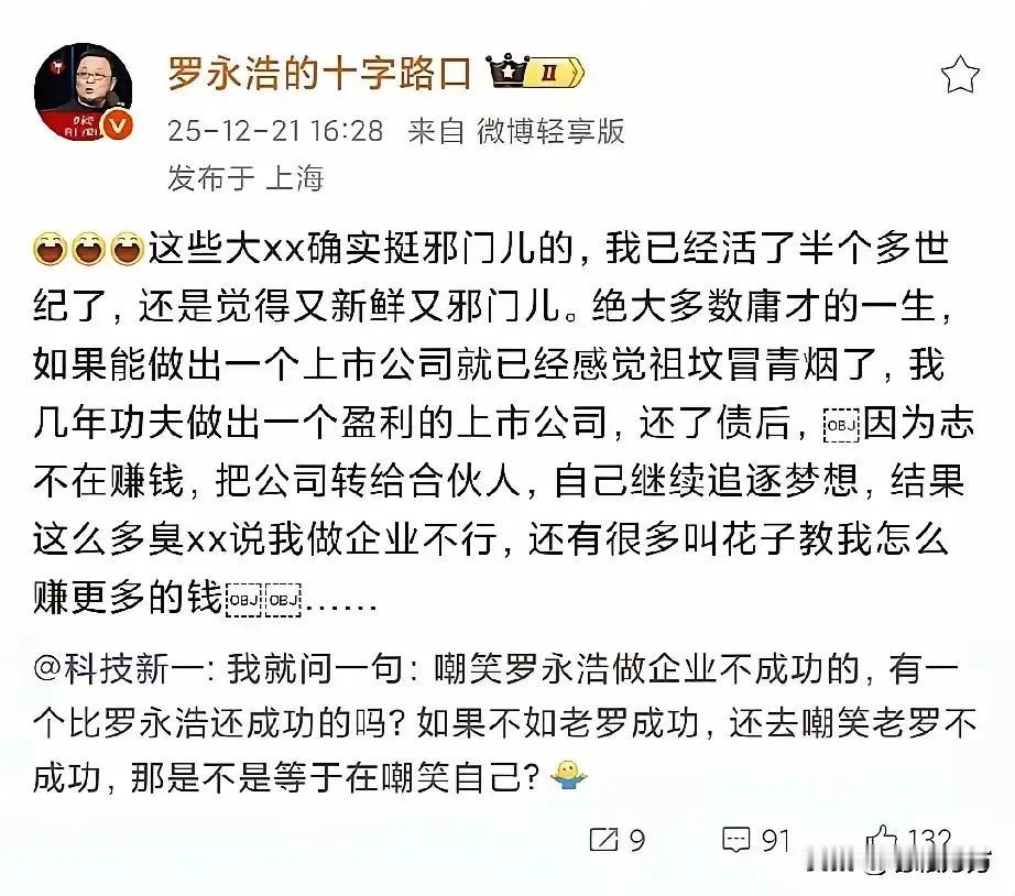 罗永浩朋友圈吐槽千兆宽带不够量,其实和项立刚没太大关系,他下场开怼老罗不太好理解,而且话题很快就脱离了事件本身,直接开始攻击老罗做企业的实力。更奇怪的是一向脏话连篇的项某这次竟然没有开骂,而是表现得很有条理的样子,当然还是没忘了自我吹嘘。 直到我看了电视《老舅》里的一个视频片段才有点儿理解,就是混混涛哥不断去霍东风的店里闹事那段。原来社会人上位有条捷径,就是证明一下你能胜过原先的社会大哥,所以羞辱一下已经退隐的霍东风就是新一代混混的上位手段。 招术挺狠,但也看由谁来用。实际上项某这个账号已经臭名远扬了,实在不行换一个马甲试试吧。