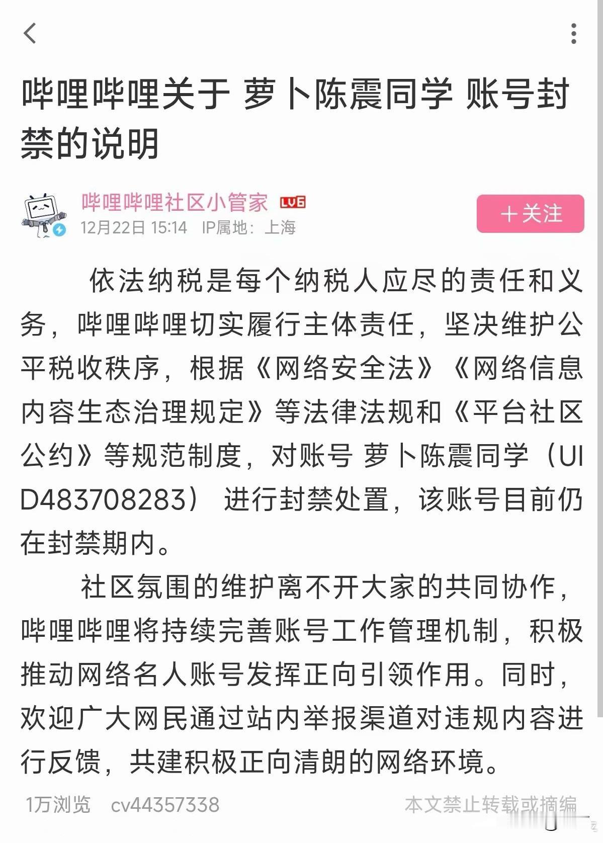 小红书和b站都发公告了,陈震仍处于禁言期[捂脸] 看来陈震多多少少在网络上这么多年还是有一点影响力的,这两天他的账号疑似好像有松动的情况,因为后续居然可以加上。 所以今天哔哩哔哩和小红书,他们的官方都专门出来做进一步的说明了,意思就是他这个号到现在为止依然是处于处理当中。 也就是说,并不是前两天传的,他的部分涉及账号恢复正常,但官方也没有解释为啥有一段时间他的这两个平台的这个账号,没有以前的那种被禁止关注的提示,而且还可以正常的加粉丝。 有人说陈震现在遇到这种情况,基本上是没有解了,因为熟悉他的人都知道,他好像是一个不喜欢结交朋友的人,简单地说就是他没有任何圈子,遇到这种情况,没有人能够帮得了他。 当然也没有任何合作的伙伴和品牌会去帮他,所以结合他前段时间的说明,意思就是他自己也不会去海外发展,那也就意味着他现在只能够静静地等待,看看情况有没有松动。 但是根据目前的这个趋势来看的话,估计在很长一段时间内,他都不会复出了,很多人都不理解,作为年收入几千万的一个大主播,为啥会为了这点数字,做这些猫腻,毕竟前段时间他因为某一个车型早发出来的十多个小时,就赔了人家500万,所以从逻辑上说他大可不必这样做。 当然,这其中的原因可能也只有他自己知道,但不管怎样,这一次对他来说,应该算得上是釜底抽薪了,不知道这是不是意味着,他从事20多年的这个职业生涯,就因为这一次永远不会再出头了,就这样走到尽头了。