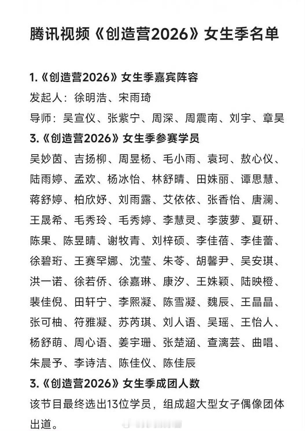 网传创造营女生季名单,真的可以选秀了吗发起人:徐明浩 宋雨琦导师:吴宣仪 张紫宁