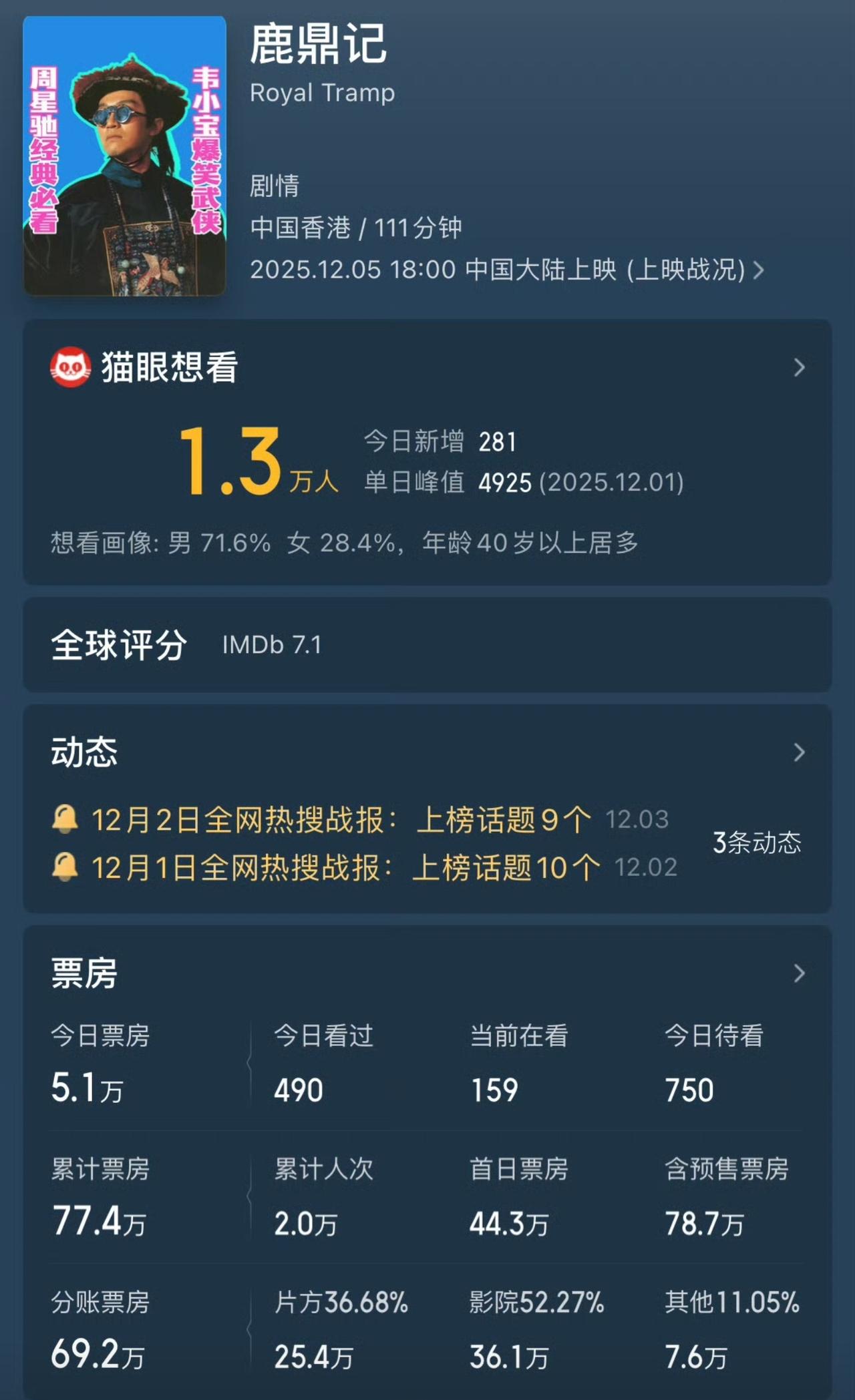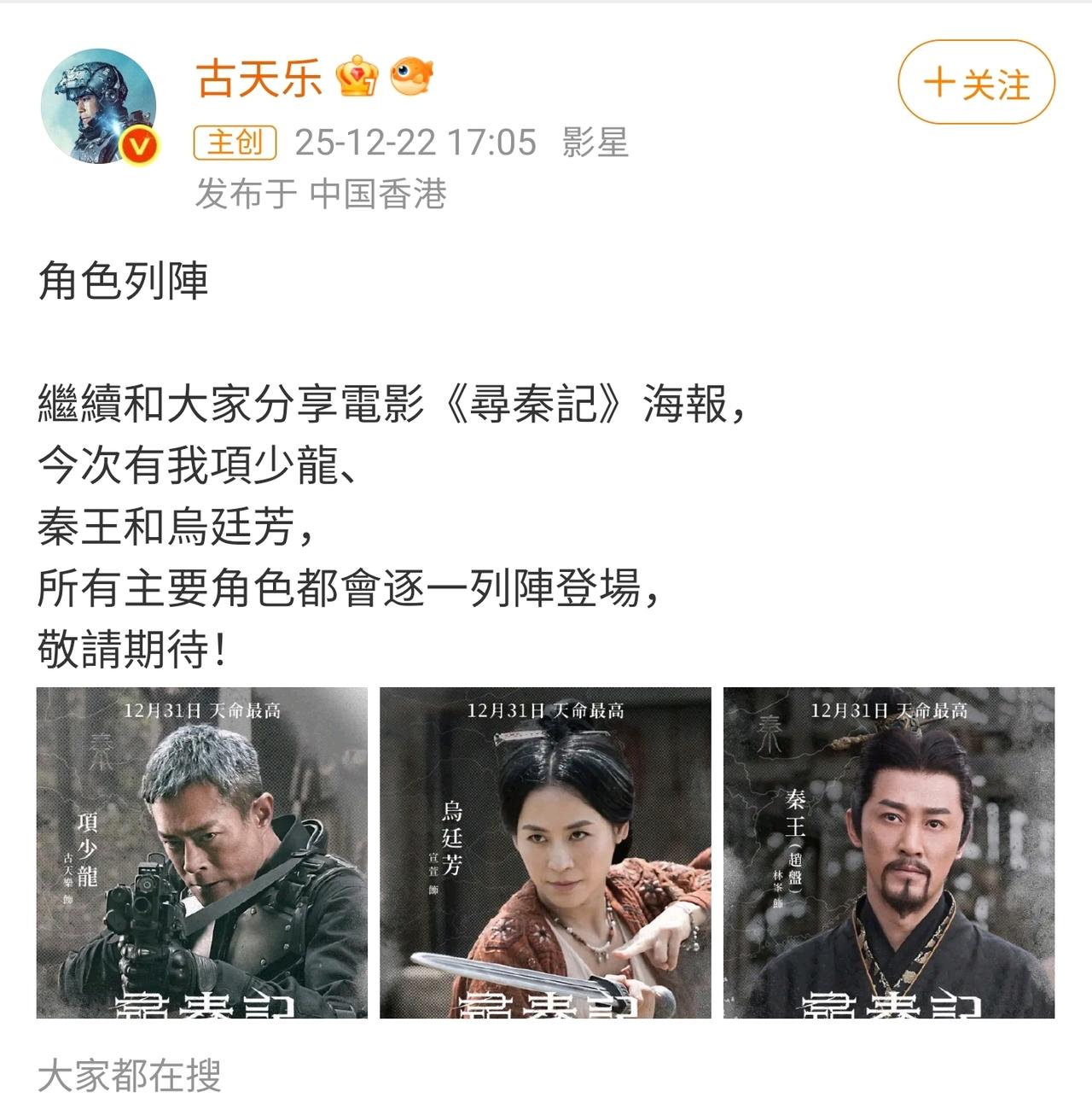 古天乐主演的电影《寻秦记》马上就上映了。 主创团队开始四处宣传,为作品预热。古天乐也在自己账号上发布了角色海报。 说实话,寻秦记这个IP其实挺不错的,很多人小时候都看过,这些年也有不少人在怀念。 但是,情怀归情怀,真要花真金白银去电影院看,我觉得还是人不多。 电影拍得再好,归根结底还是炒冷饭。 之前周星驰的《鹿鼎记》和《食神》也重映了,票房同样不太乐观。 那时候那么多人都说欠周星驰电影票,结果没多少人去换。 古天乐这个寻秦记,我估计最后票房,很难达到一个亿。
