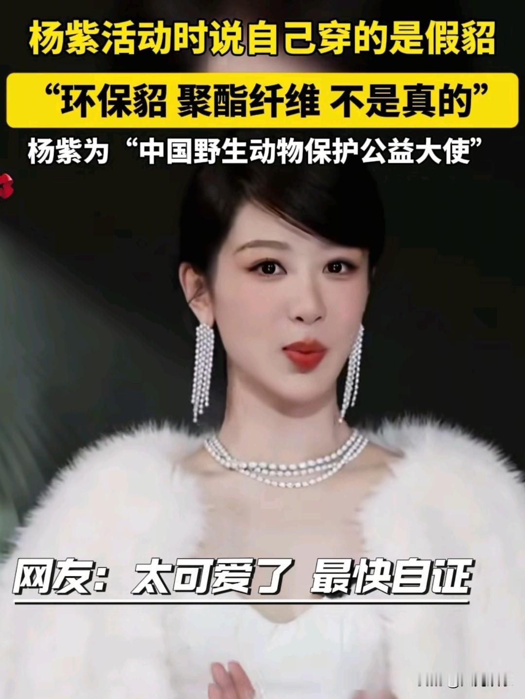 杨紫作为野生动物保护公益大使,居然穿着貂皮大衣参加活动?没想到杨紫说她穿的是假貂,不是真的。 据杨紫透露,她穿的是环保貂,是用聚酯纤维做的,不是真的貂,她还是希望大家保护野生动物。 很多网友评论,杨紫的求生欲太强了,其实很多人都没有发现这个问题,她却第一时间做出了澄清,真是太可爱了。