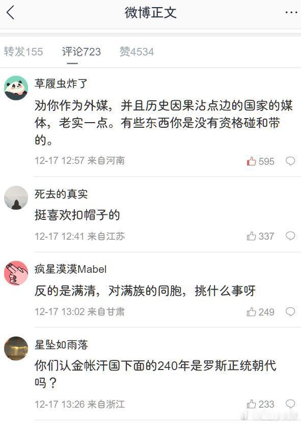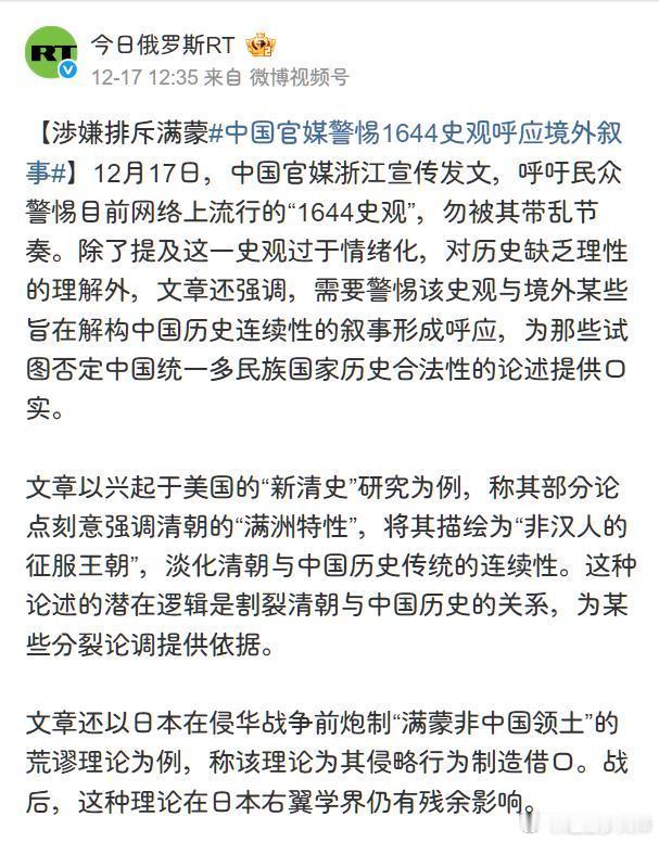 RT这个俄罗斯媒体跟着某些大V起舞,我看是自找没趣,看见评论区了吗?转发区的无能狂怒里甚至没有大V,你看大V们,带完节奏就把粉丝给卖了,可笑可笑。警惕1644史观带乱了节奏
