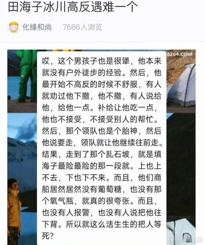 别把“征服”当勋章,23岁硕士魂断雪山,是大山给的最后警告! “我能战胜大山”——多少户外爱好者把这句话当成热血宣言,却忘了登山圈最扎心的真相:所有平安归来的人,都是大山网开一面的馈赠。 23岁硕士违规闯入田海子山封山区,身体发出高反预警时不听劝阻,执意向前,最终在冰川区域突发不适,生命永远定格在雪山之上。这场悲剧,哪里是“征服自然”的壮烈,分明是漠视规则的代价。 田海子山冬季封山,本就是用血的教训划下的安全红线。冰崩、雪崩、极端低温,每一项都是致命威胁。可涉事团队揣着“三无”底牌——无许可、无资质、无报备,就敢闯进海拔4000多米的禁区。 更荒唐的是,行程设计跳过阶梯海拔适应,急救装备严重缺失,领队连高反致命的常识都没有,这样的“探险”,从一开始就是赌命。 遇难者的“硬扛”更让人痛心。头痛、乏力明明是高反的求救信号,路人递来的药物是救命稻草,他却一次次拒绝。 很多人总觉得年轻就是资本,觉得“我能扛过去”,却不知道高原脑水肿会侵蚀判断力,更不知道重症高反可能在几小时内夺走生命。所谓的“意志力”,在残酷的自然面前,不堪一击。 社交平台上那些“有腿就能登顶”的网红攻略,更是帮凶。它们把高难度技术型山峰包装成打卡地,绝口不提封山令和无救援的现实,让无数人产生“我也行”的错觉。 可大山从不会因为你年轻、学历高就格外宽容,漠视规则的人,终究会被规则反噬。 山永远在那里,它从不拒绝敬畏它的人,但也绝不会放过挑衅它的人。 别再把“征服”挂在嘴边了,对自然多一分谦卑,对规则多一分敬畏,才是对生命最基本的负责。