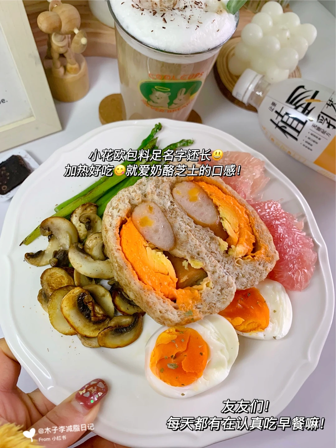 🍳早午餐:黑巧➕芦笋➕口蘑➕柚子➕植物乳茶咖啡奶泡➕鸡蛋➕奶酪厚蛋芝士肠欧包