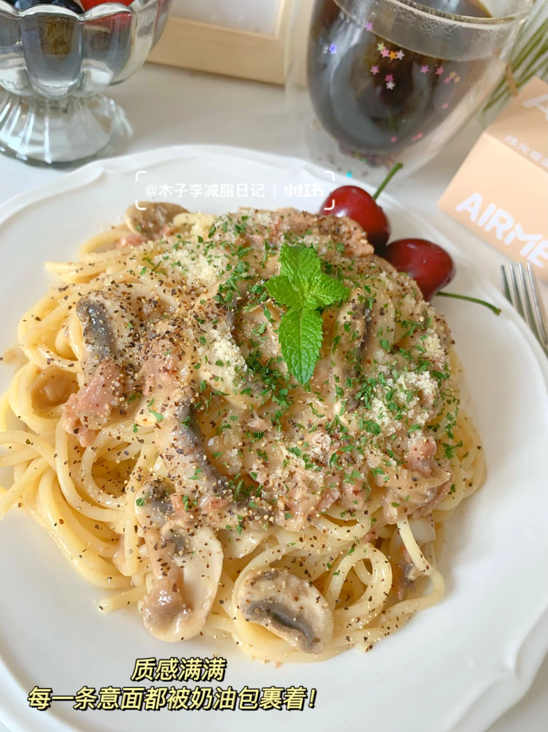 🍳早餐:奶油培根蘑菇意面➕黑咖啡➕樱桃➕蓝莓