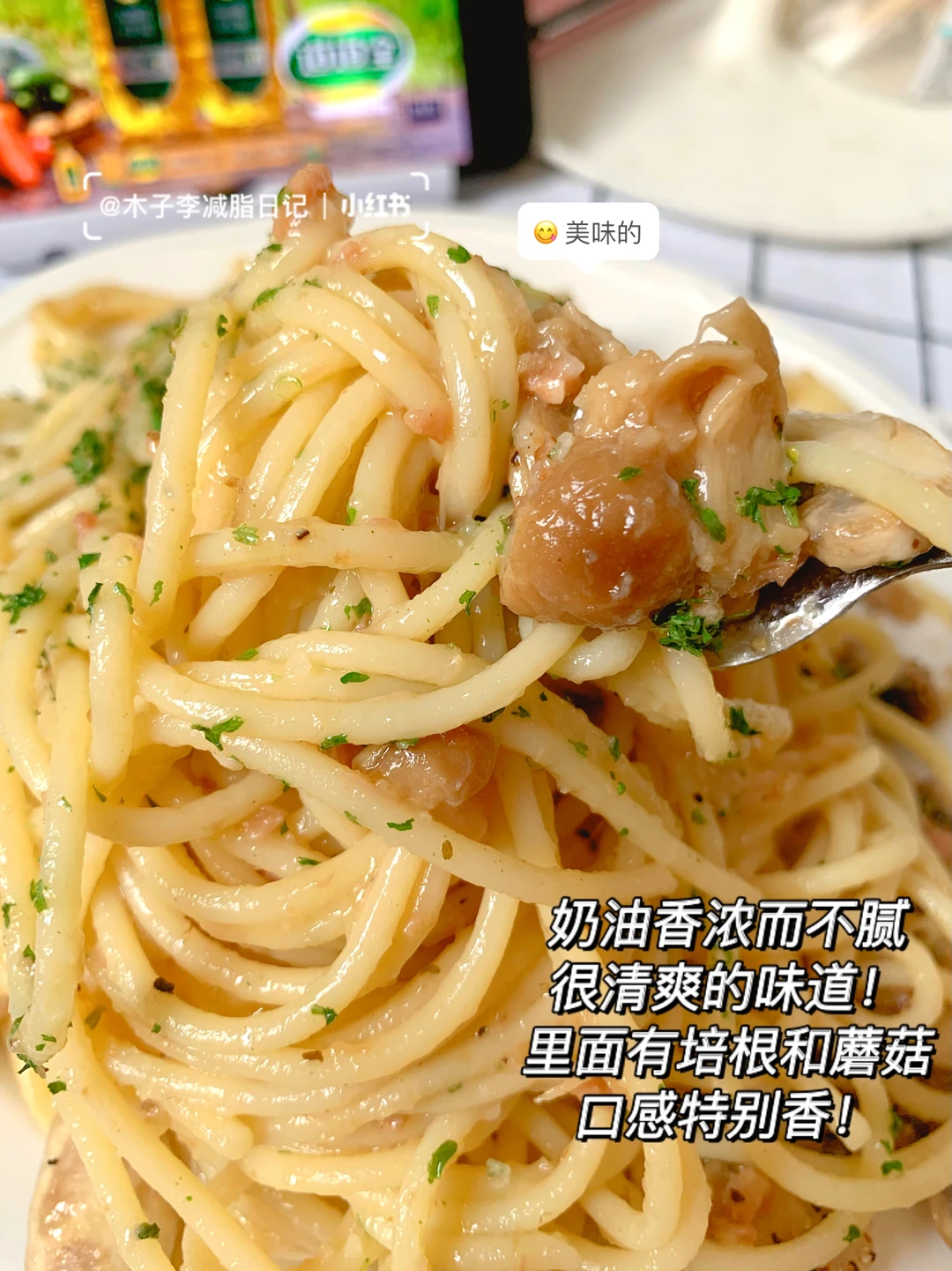 📣:天天刷到意面馋😭我了!今日早餐就吃奶香浓郁的奶油培根白葡萄酒意面!Q弹爽滑意面被奶油浓郁的酱汁包裹着!嗦一口好满足哦!还有大颗培根🥓粒~满口咸香!看着就馋😋不行了!