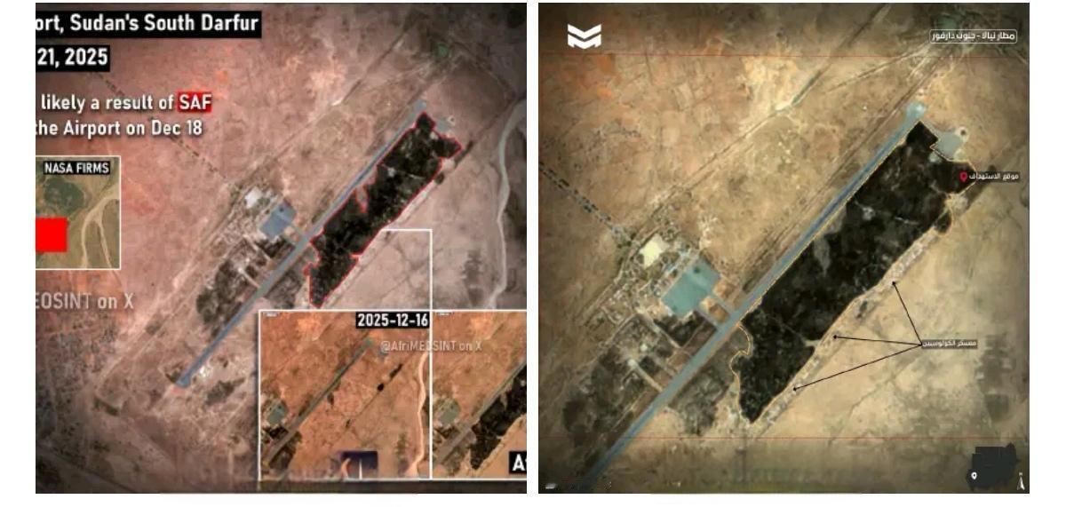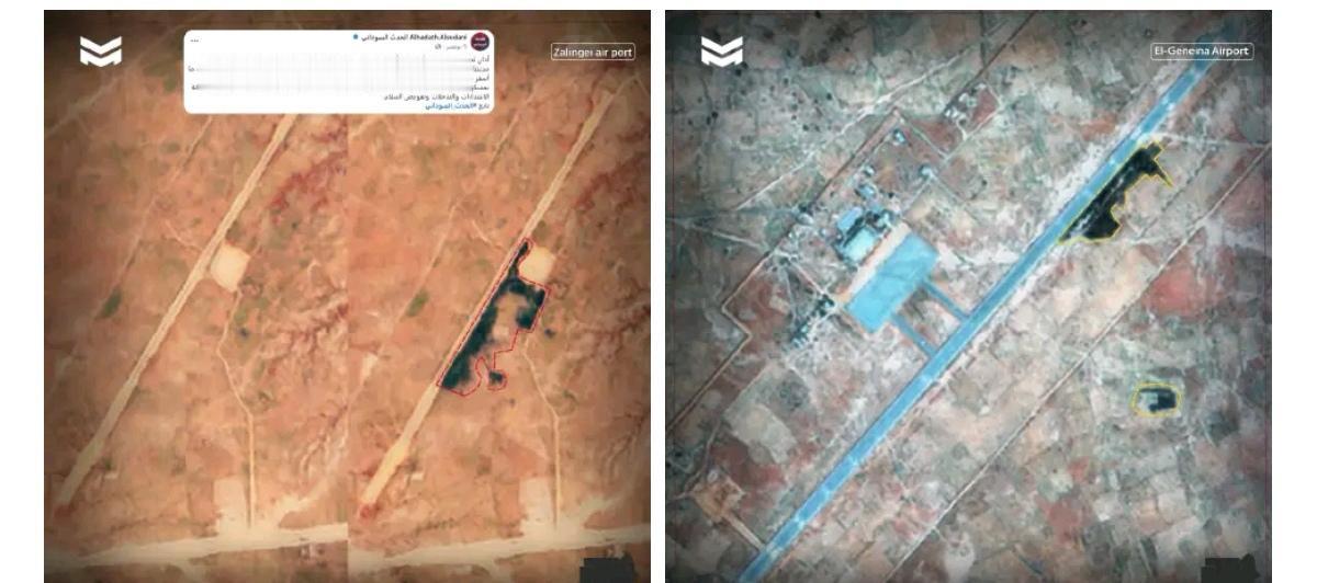 12月21日的卫星图像显示,南达尔富尔州尼亚拉机场有一块燃烧痕迹,可能是12月18日报道的苏丹武装部队无人机打击造成的。 受打击的地区包括一个加固的无人机掩体和一个外国佣军(包括哥伦比亚人)使用的大型营地。 大火集中在帐篷附近,从机场围栏周边一直蔓延到跑道。 苏丹空军此前对尼亚拉机场进行了数十次打击,导致机场关闭,但快速支援部队继续试图重新启动机场,用于发射无人机或运送哥伦比亚佣军,并将他们送回索马里兰地区。 达尔富尔 ◉11月4日,苏丹空军对达尔富尔的扎林盖机场进行了打击。导致货物卸货区附近的草原起火,表明武装部队的目标是物资。 上周,苏丹空军还打击了朱奈纳机场,引发了一场蔓延至跑道附近的大火。 ◉在十二月初,跑道亦曾发生轻微火警。