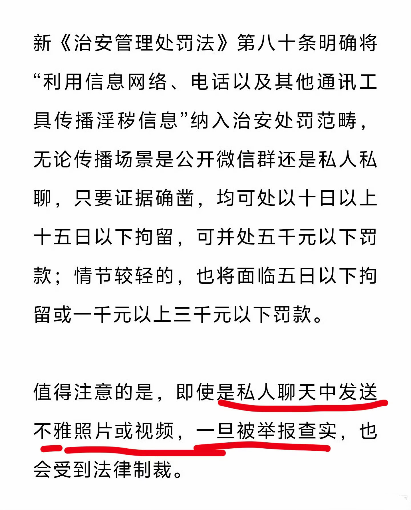 明年起向好友发淫秽信息违法 注意点吧,可能有的表情包都不行了。还比如情侣之间发点什么,等分手俩人闹掰了反手就是一个举报,这你说扯不扯。。。淫秽这怎么定义?谁来定义?