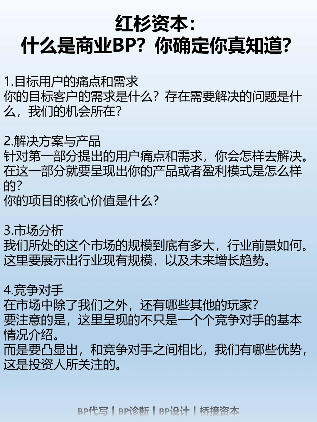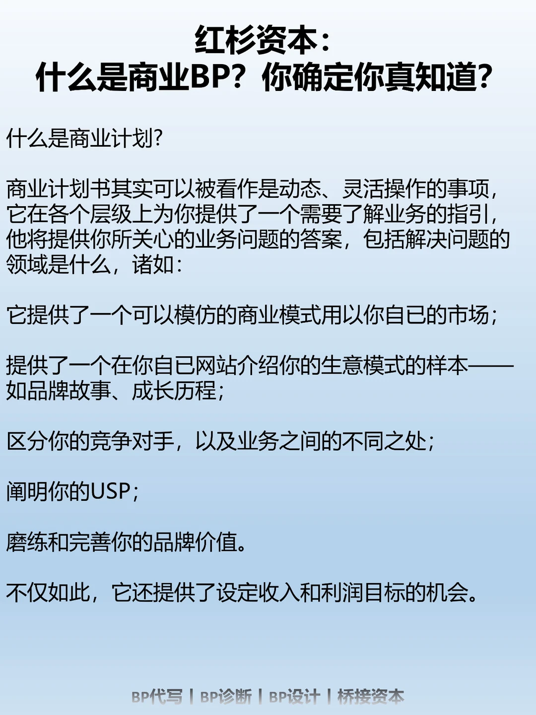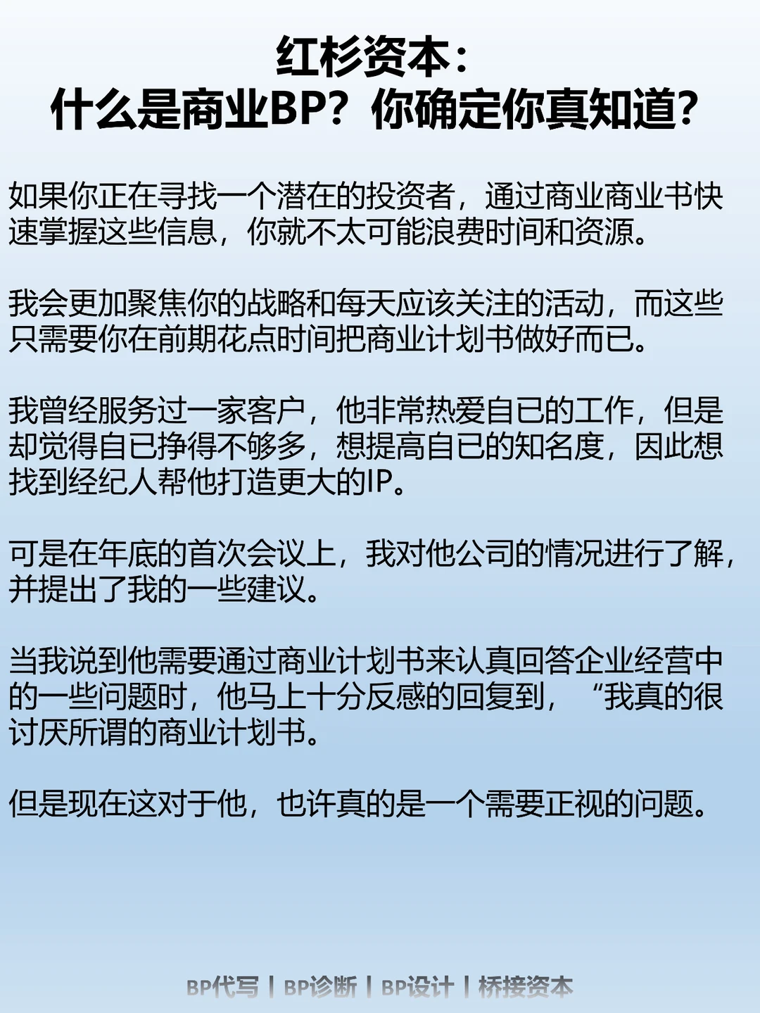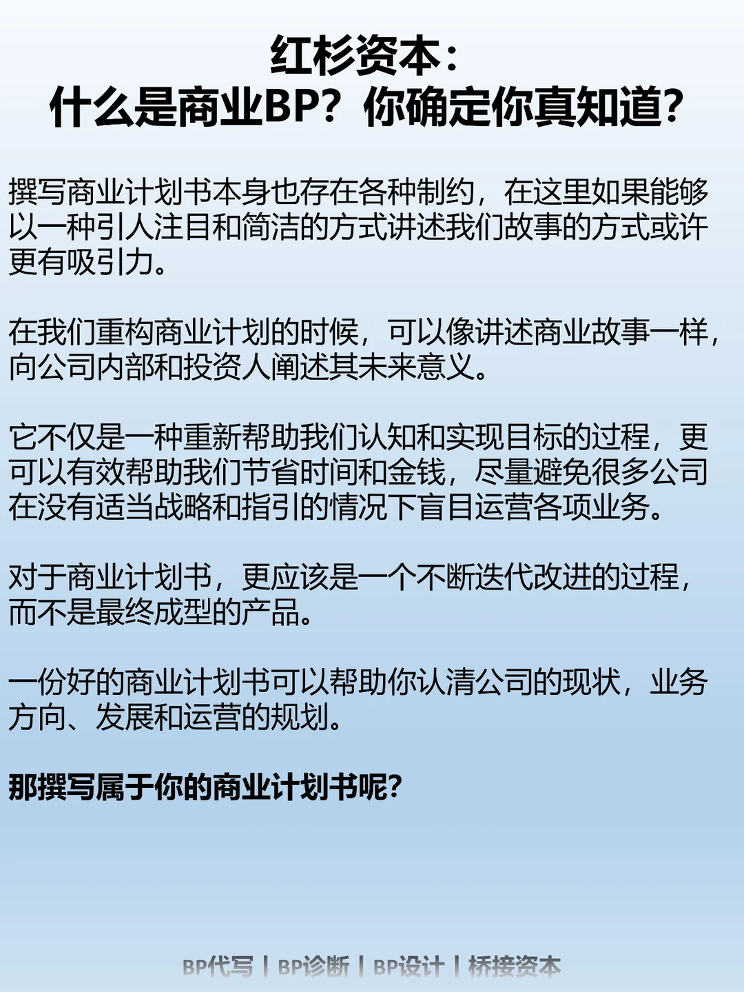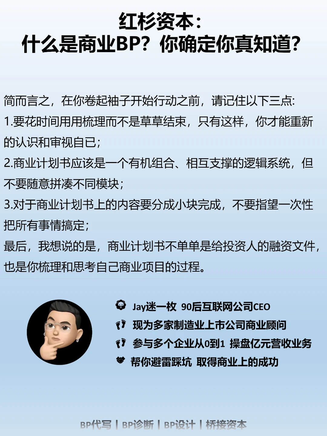 简而言之,在你卷起袖子开始行动之前,请记住以下三点: 1.要花时间用用梳理而不是草草结束,只有这样,你才能重新的认识和审视自已; 2.商业计划书应该是一个有机组合、相互支撑的逻辑系统,但不要随意拼凑不同模块; 3.对于商业计划书上的内容要分成小块完成,不要指望一次性把所有事情搞定; 最后,我想说的是,商业计划书不单单是给投资人的融资文件,也是你梳理和思考自己商业项目的过程。