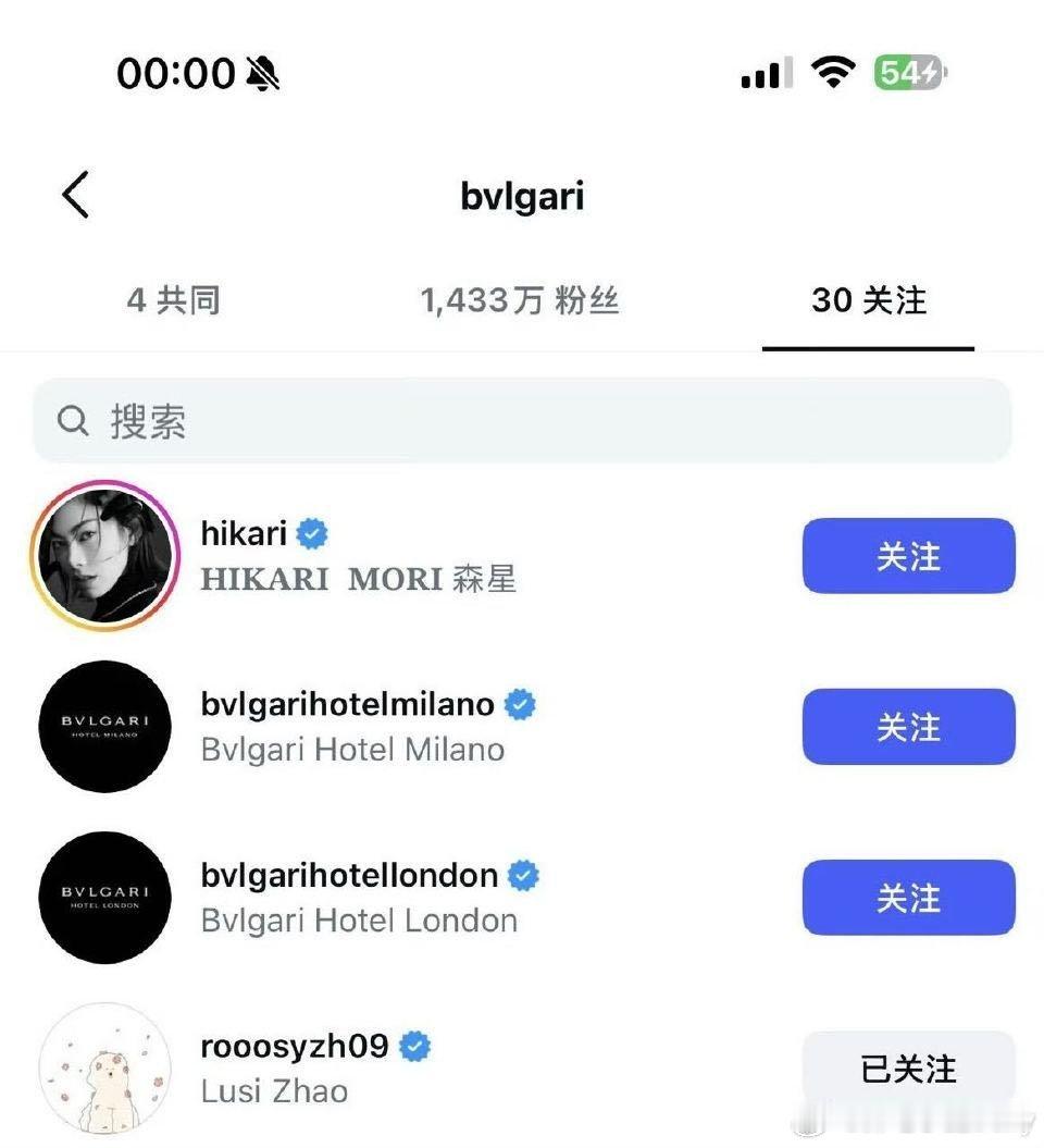 在和宝格丽CEO互关了几年的基础上,宝格丽官方ins也关注了赵露思
